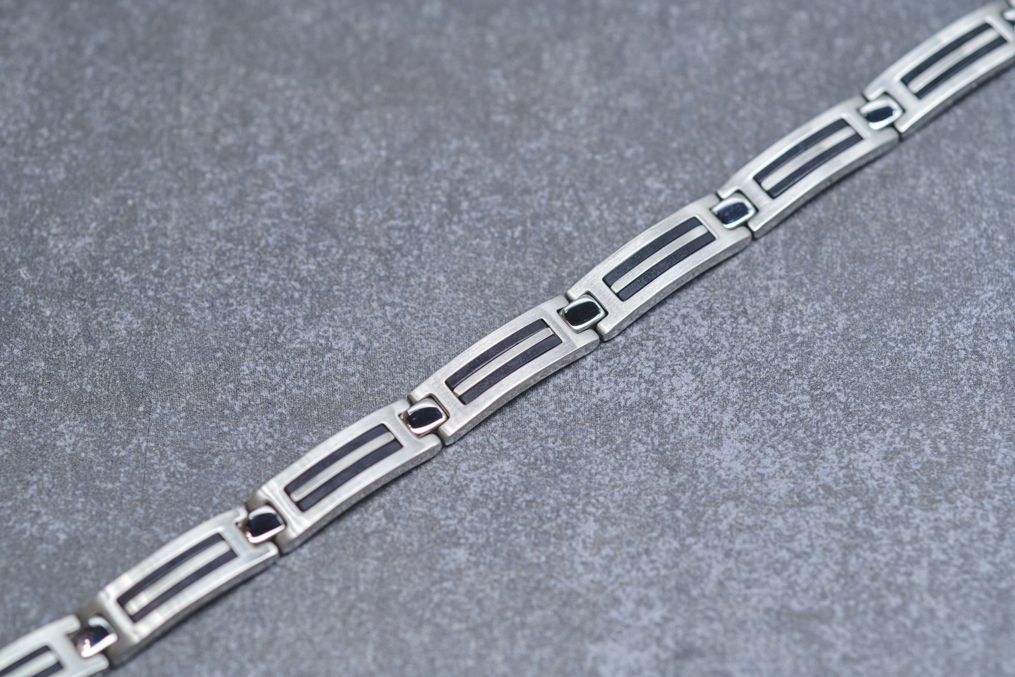Un bracelet résistant à porter au quotidien. Grâce à sa conception en acier 316L inoxydable blanc brillant et laque noire, le bracelet Sandro de Phebus peut être porté tous les jours et ne nécessite pas d'entretien trop régulier. Le bracelet est garanti 2 ans en cas de problème. Un look minimaliste et masculin. Si tu cherches un bijou au look discret, mais masculin et intense, le bracelet Sandro pour homme est fait pour toi ! Il t'aide à affirmer ton style vestimentaire grâce à ses lignes épurées et son mélange brut d'acier inoxydable et de résine noire.