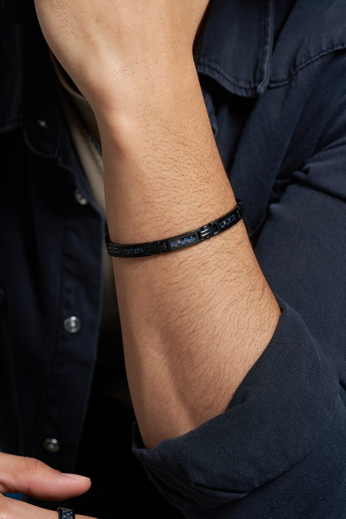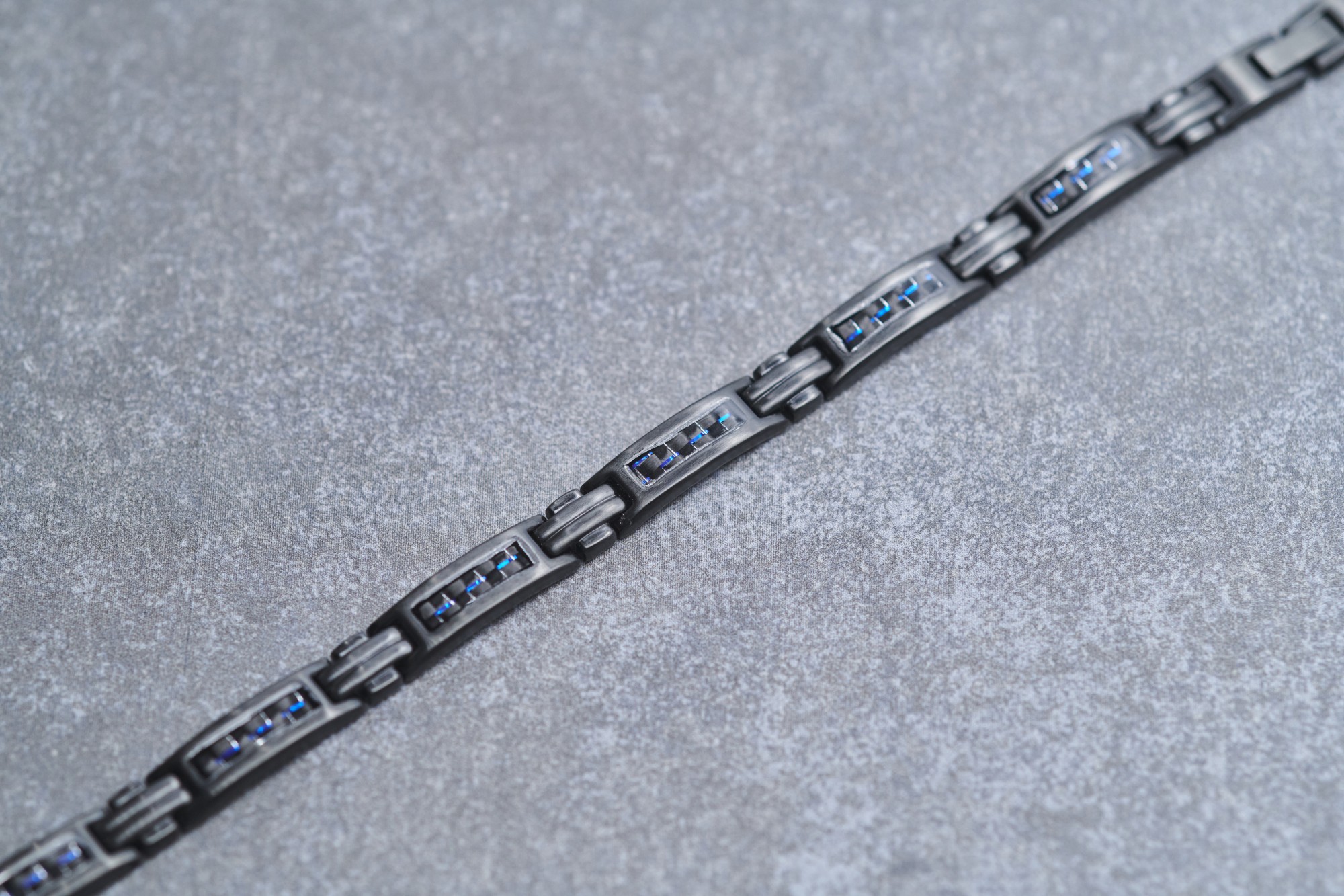 Un accessoire coup de cœur, entre robustesse et modernité. Ce bracelet en acier 316L inoxydable et PVD noir brillant est rehaussé de touches de carbone bleu. Ce dernier apporte un effet lumineux et une touche d'élégance supplémentaire. Ajustable de 19,5 à 21 cm et garanti 2 ans, le bijou te suit au quotidien grâce à un solide fermoir à clip double. Un accessoire au look futuriste. Ce petit chef-d'œuvre signé Phebus se distingue par ses détails soignés et son petit côté avant-gardiste. Libère-toi des diktats en adoptant ce bijou inoxydable dont la structure en plaques convient à tes tenues chics et tendance.