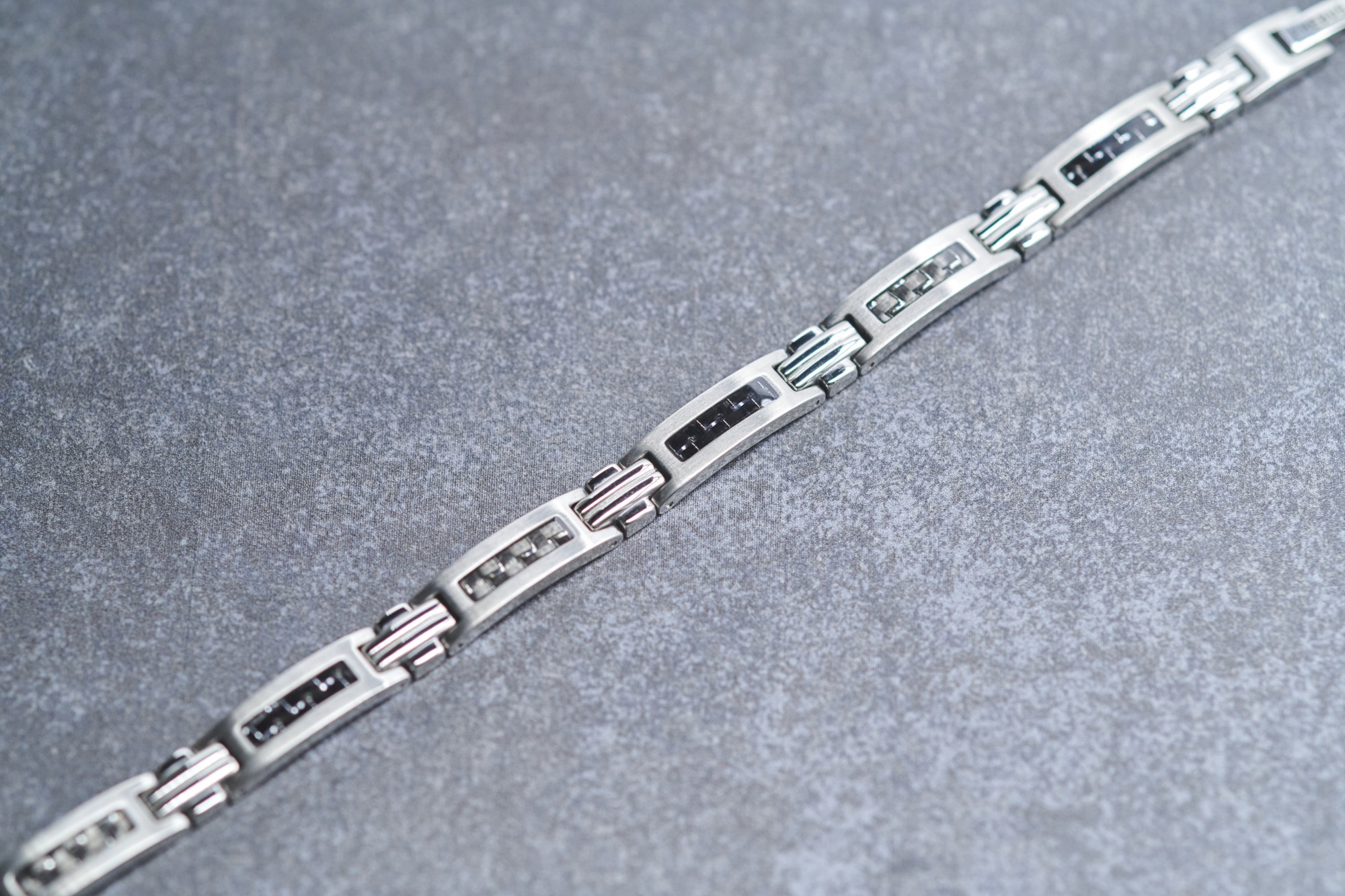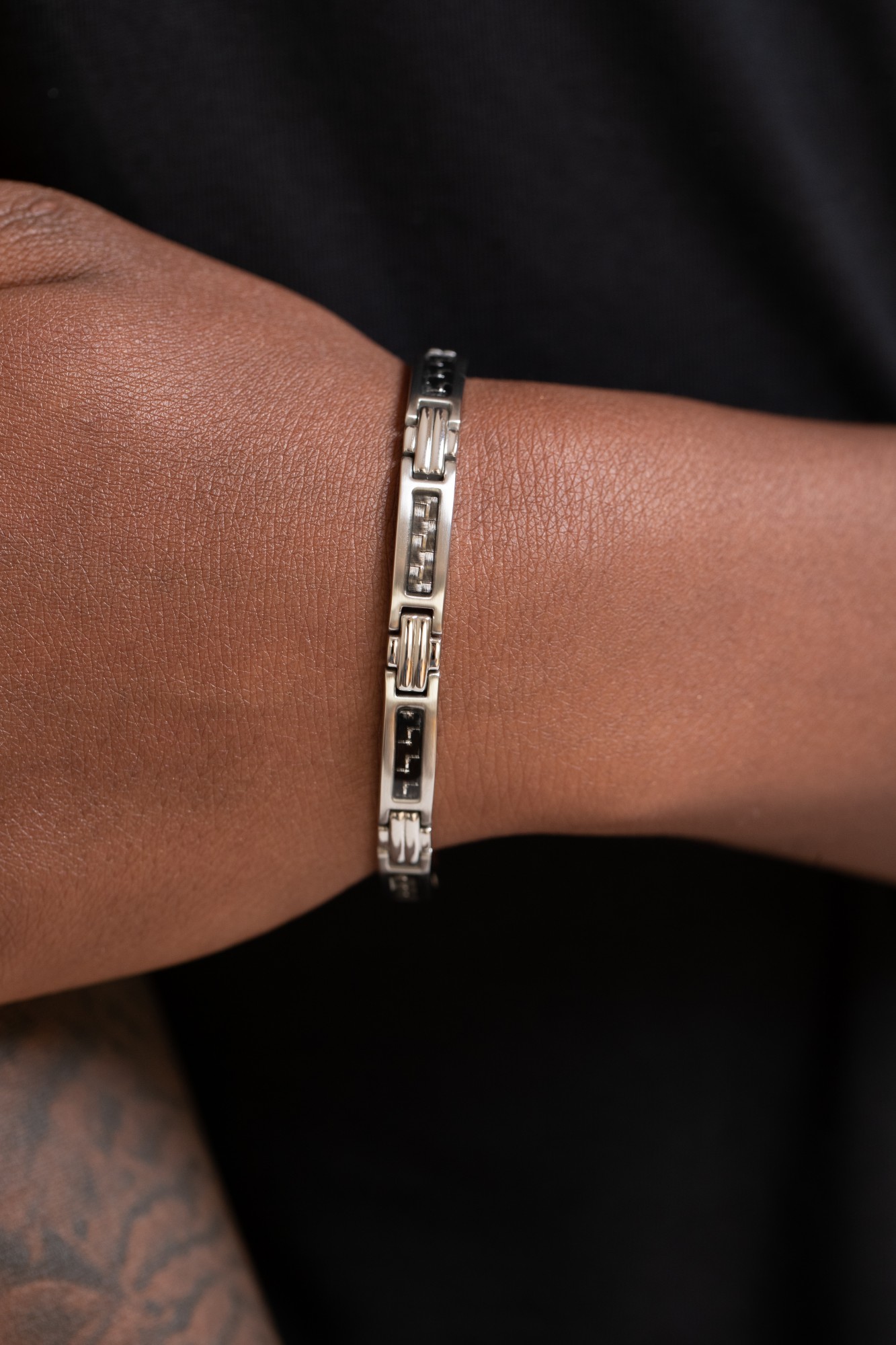 L'acier inoxydable sous ses plus beaux atours. Un bracelet articulé en acier 316L inoxydable blanc brillant complété de carbone noir, dont les motifs alternés attirent le regard. Réglable entre 19 et 21,5 cm, ses dimensions le rendent facile à porter. Sécurisé par un clip double, il est garanti 2 ans. Un ornement masculin qui traduit ton sens du style. Associé à une tenue classique ou chic, ce bijou Phebus pour homme se suffit à lui-même et apporte de beaux reflets à ton allure. Un accessoire idéal pour arborer un look attrayant chaque jour.