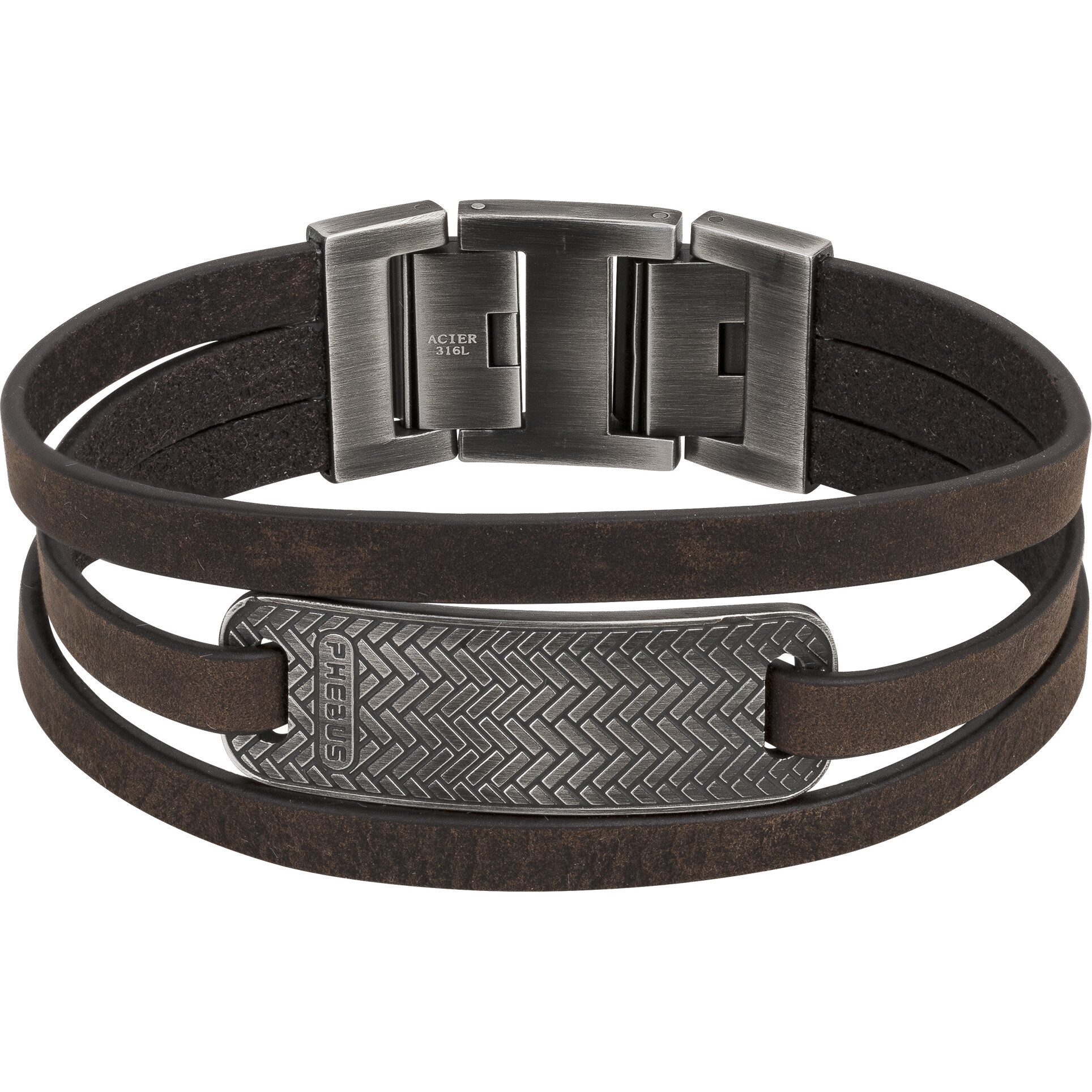Un mélange solide d'acier inoxydable et de cuir. Le bracelet Amos de Phebus est conçu à partir d'acier 316L inoxydable gris vieilli et de trois bandelettes de cuir marron. Réglable de 19 à 20,5 cm et fermé par un double clip, ce bijou est garanti 2 ans. Un design ultra original. Le bracelet Amos pour homme a été créé pour apporter une touche originale à tes tenues. C'est le bijou parfait si tu veux que l'on te remarque sans en faire trop. Il s'associe idéalement à une tenue casual ou à une chemise en jean.