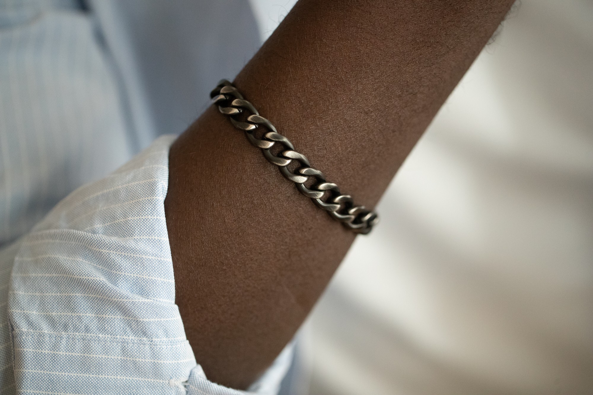 Bracelet à mailles gourmettes pour homme Phebus en acier 316L inoxydable PVD gris vieilli. Un bracelet gourmette est un bijou qui est porté au quotidien par son propriétaire : il est donc indispensable qu'il ne se dégrade pas avec le temps. Notre bracelet Hazou est garanti deux ans et conserve son aspect initial année après année, grâce à sa conception en acier inoxydable de grande qualité. Un accessoire intemporel revisité. Avec sa couleur gris vieilli, le bracelet Hazou ne manque pas de cachet ni d'originalité. Un bijou résolument masculin qui séduit à coup sûr ! Mixe-le à tes autres accessoires pour affirmer ton style avec splendeur.