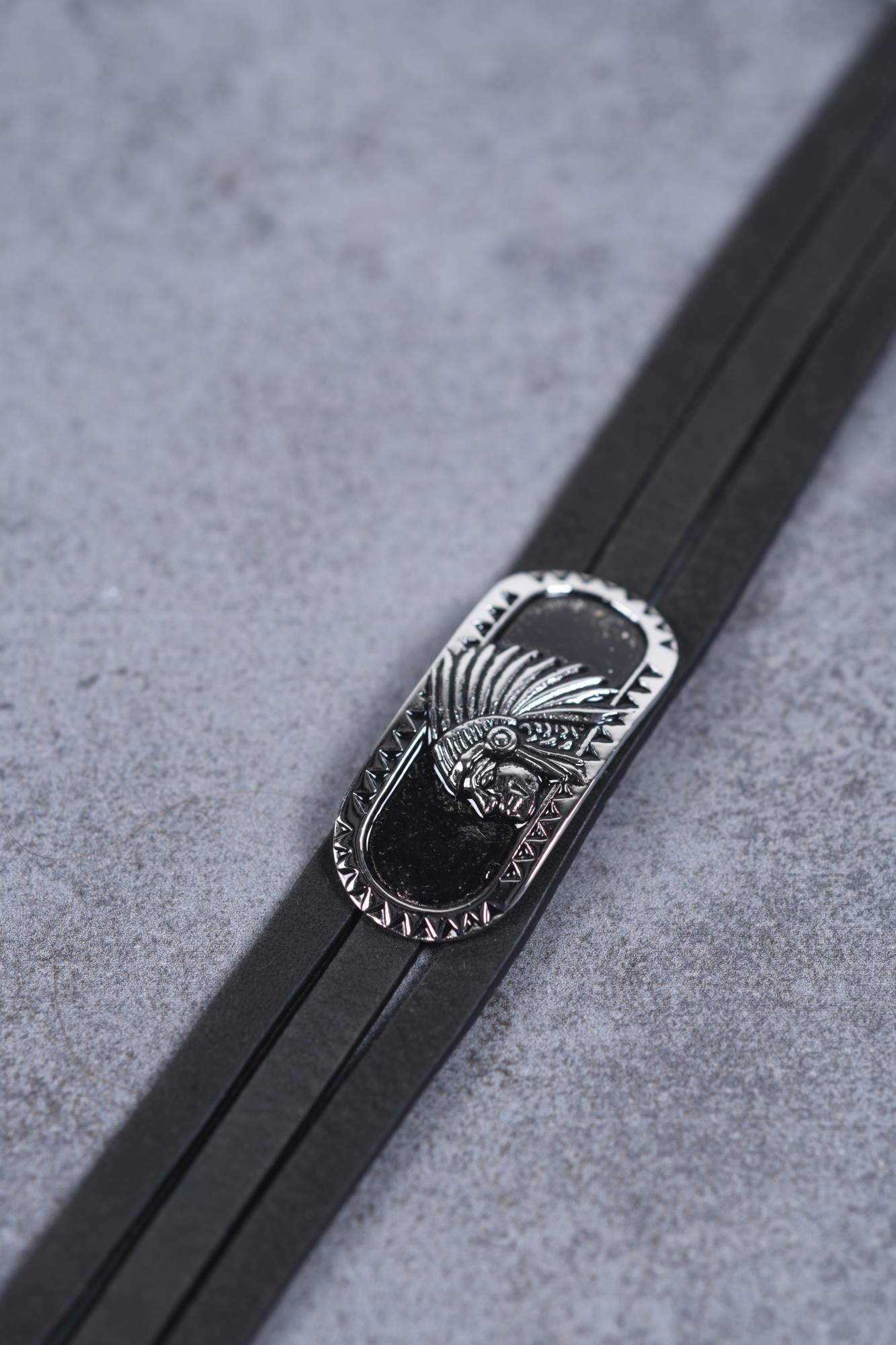 Un accessoire inspirant, robuste et original. Le bracelet souple Igor est constitué de trois bandes de cuir noir au style vintage, associées à une plaque en acier 316L inoxydable à motif. Celui-ci représente un visage iroquois, doté d'une riche symbolique. Réglable de 19 à 20,5 cm de longueur, cet accessoire résistant est sécurisé par un double clip et garanti 2 ans. Un bijou Phebus tendance, alliant force et finesse. Destinée aux hommes au style affirmé, cette pièce forte te permet d'accessoiriser ton look en te différenciant. Montre tes valeurs et ton côté obstiné avec ce bracelet inoxydable qui te correspond.