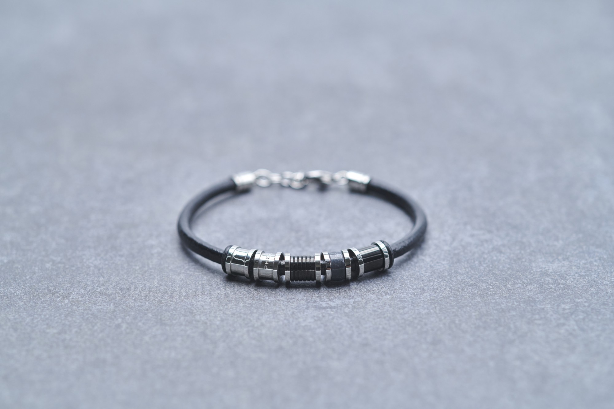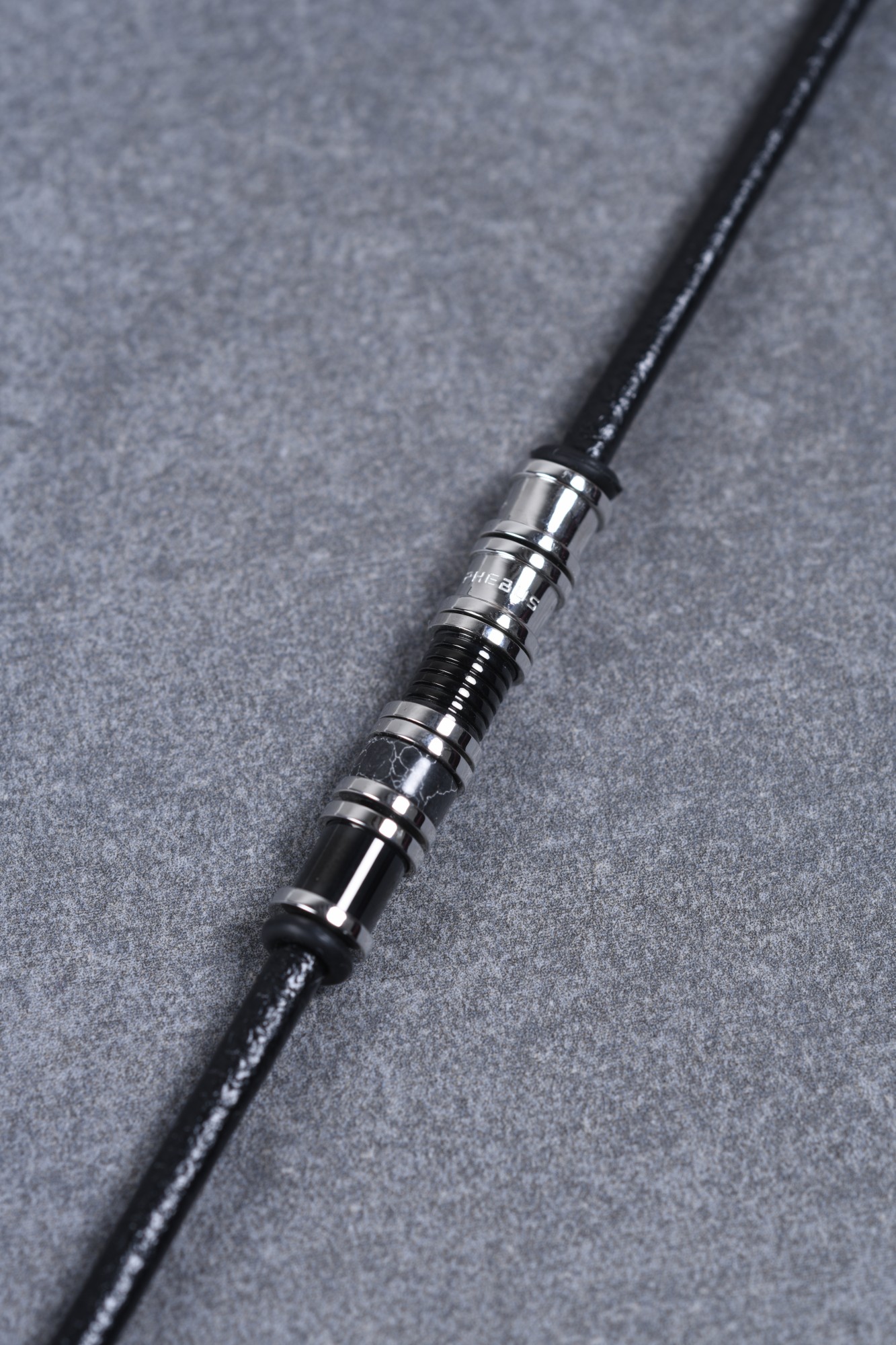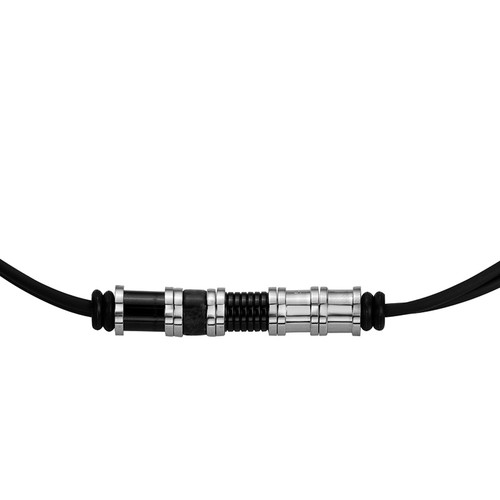 Un style classe et dynamique, des matériaux robustes et tendance. Voici un bracelet souple composé de motifs en acier 316L inoxydable blanc et noir, enfilés sur un cordon noir en cuir de vachette rond et lisse. Réglable de 19,5 cm à 21,5 cm et fermé par un mousqueton, il est garanti 2 ans. Opte pour un bijou de caractère, moderne et confortable. Cette pièce Phebus très stylée plaît à de nombreux hommes grâce à la qualité de ses matériaux et de ses finitions. L'acier inoxydable et le cuir noir en font un accessoire rock, pour un look affirmé et intrépide !