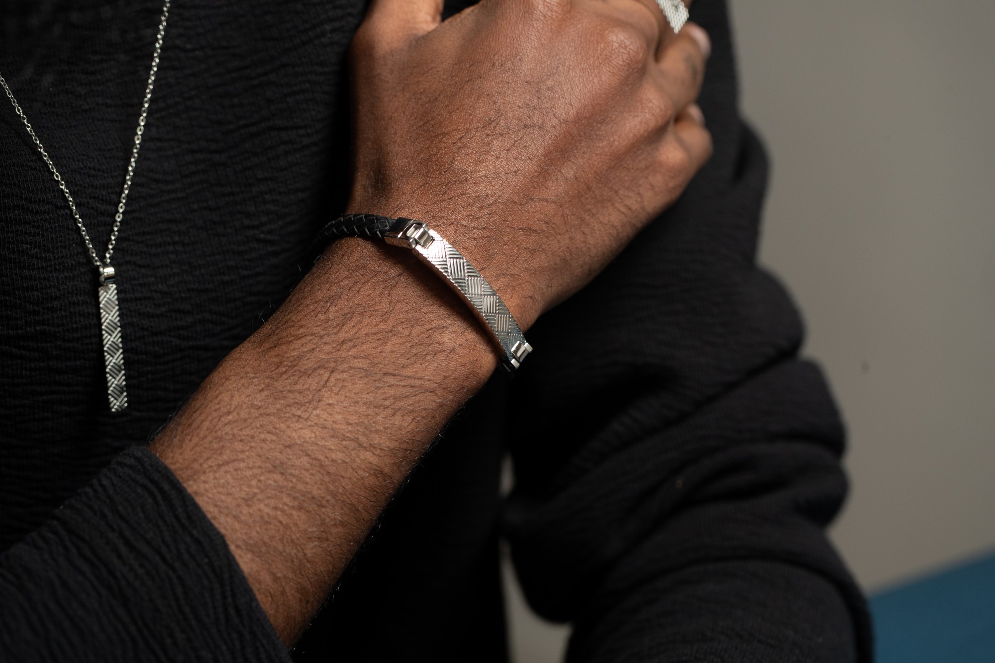Le bracelet homme Raph reflète parfaitement l’univers urbain et contemporain de Phebus. Réalisé en cuir noir tressé, il se distingue par sa plaque centrale en acier gravé, qui apporte une touche graphique et moderne. Son fermoir sécurisé en acier garantit un porté fiable et confortable au quotidien.