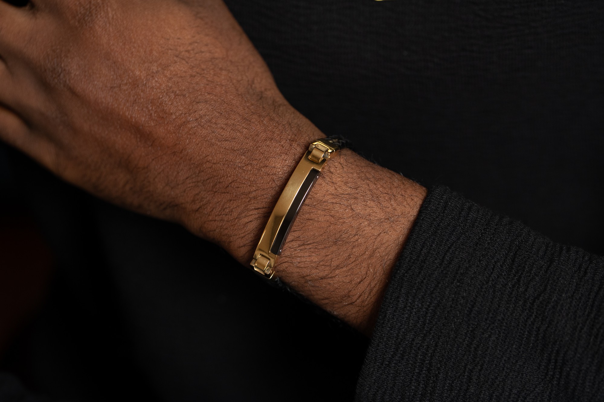 Le bracelet homme Sékou illustre toute la force du style urbain et contemporain de Phebus. Réalisé en cuir noir tressé, il s’orne d’une plaque centrale en acier doré rehaussée d’un détail noir qui accentue son allure graphique et moderne. Le fermoir en acier doré vient compléter le design, alliant sécurité et confort au quotidien.