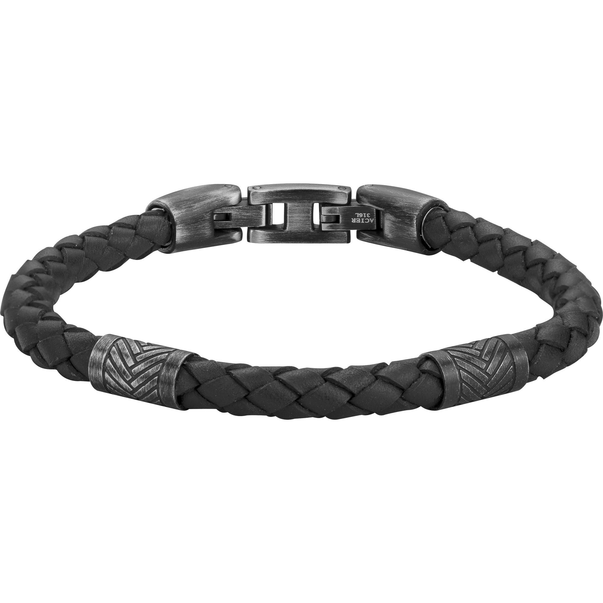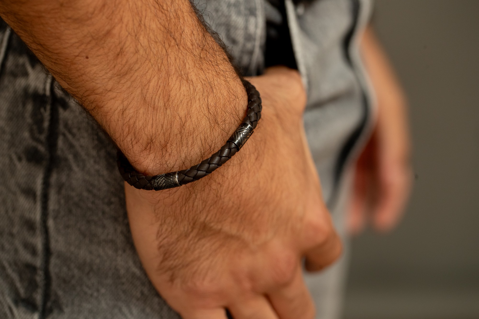 Le bracelet homme Zayn existe aussi en version acier noir vieilli, pour un look plus brut et authentique. Conçu en cuir noir tressé, il se distingue par ses anneaux en acier noir gravé, qui renforcent son caractère graphique et moderne. Son fermoir en acier noir vieilli complète le design, alliant sécurité et praticité au quotidien.