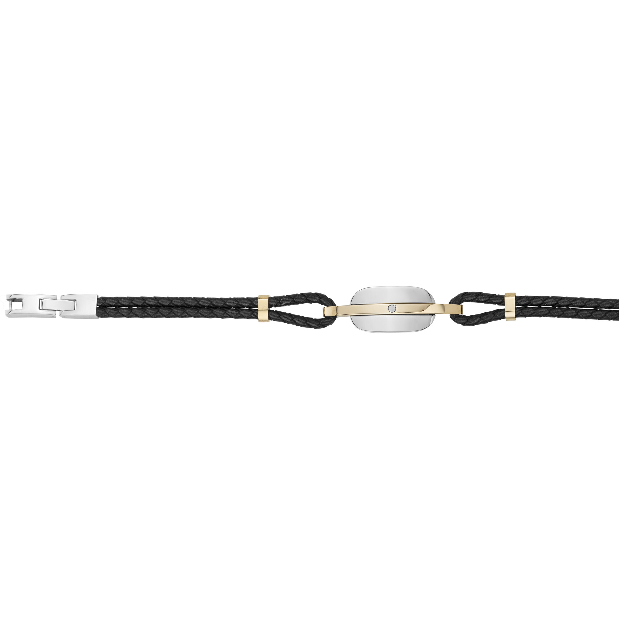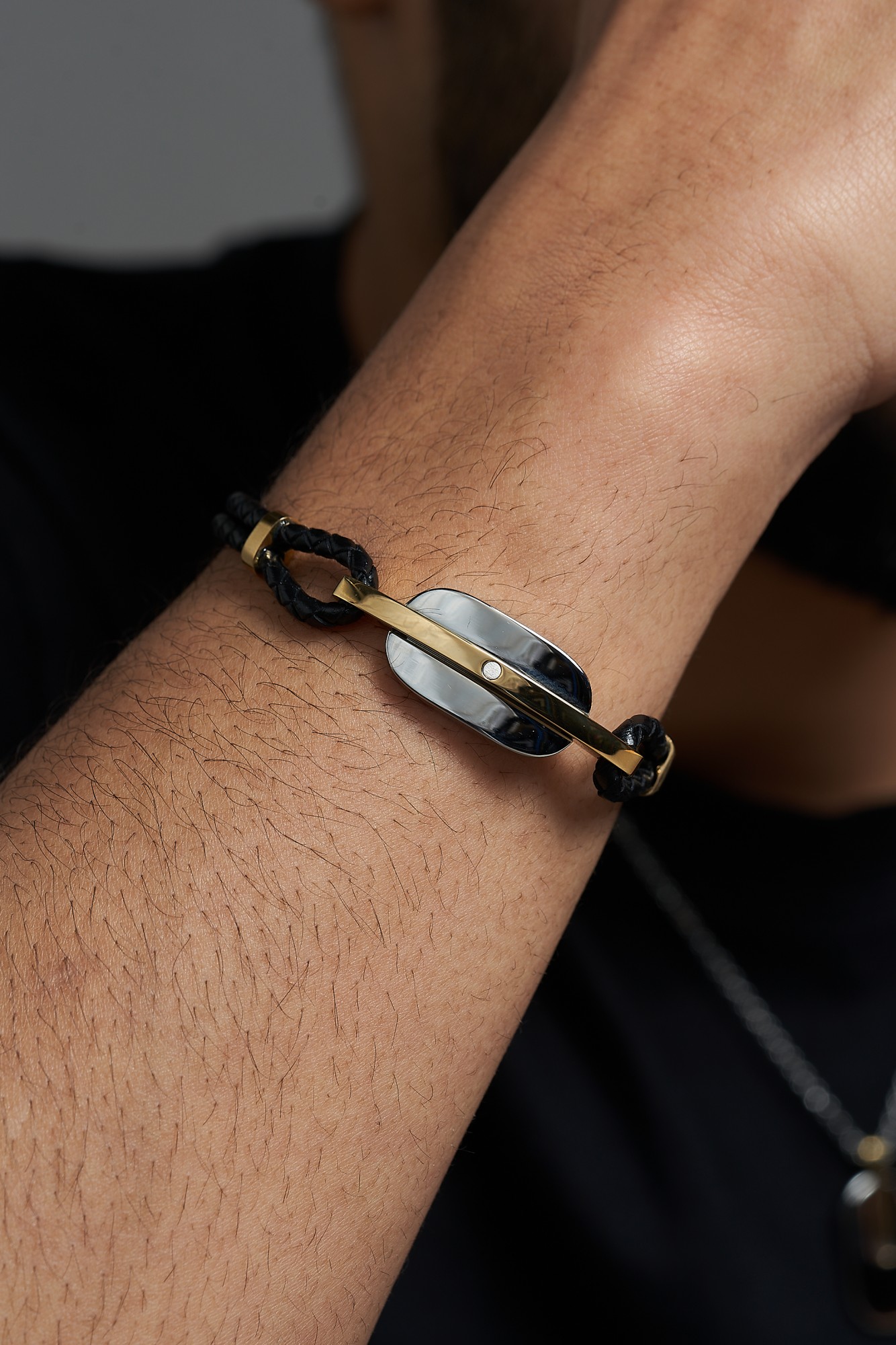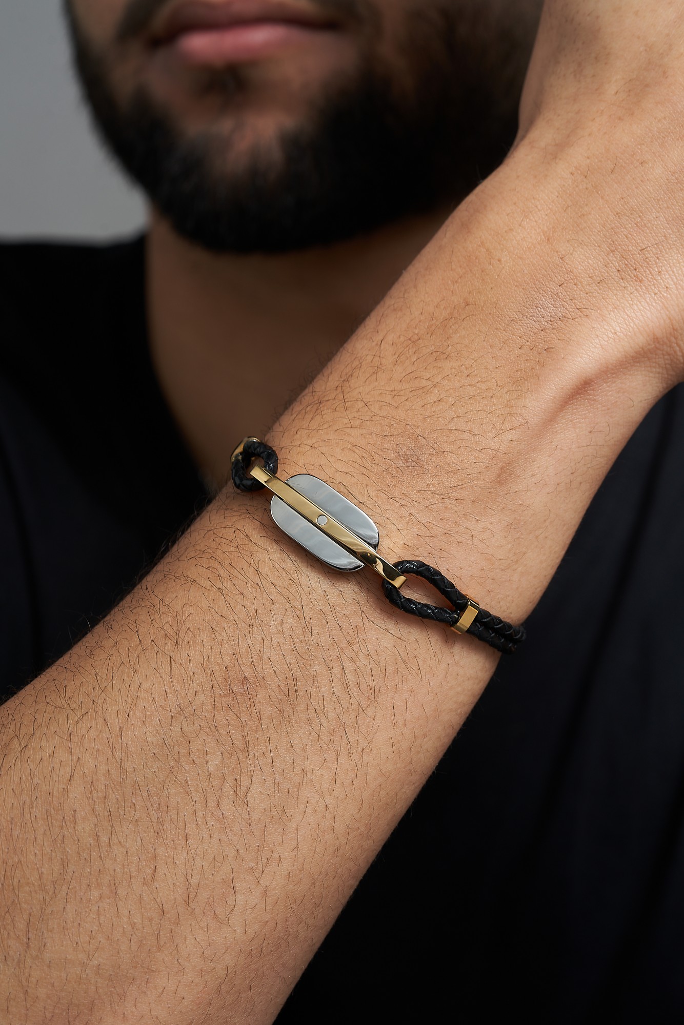 Le bracelet homme Yassine se décline en version acier argenté et doré, pour un contraste élégant et contemporain. Réalisé en cuir noir tressé, il se distingue par son élément central en acier argenté, traversé d’une barre en acier doré qui apporte un relief graphique et moderne. Des finitions en acier doré et argenté viennent compléter l’ensemble, fidèle au style urbain et masculin de Phebus.