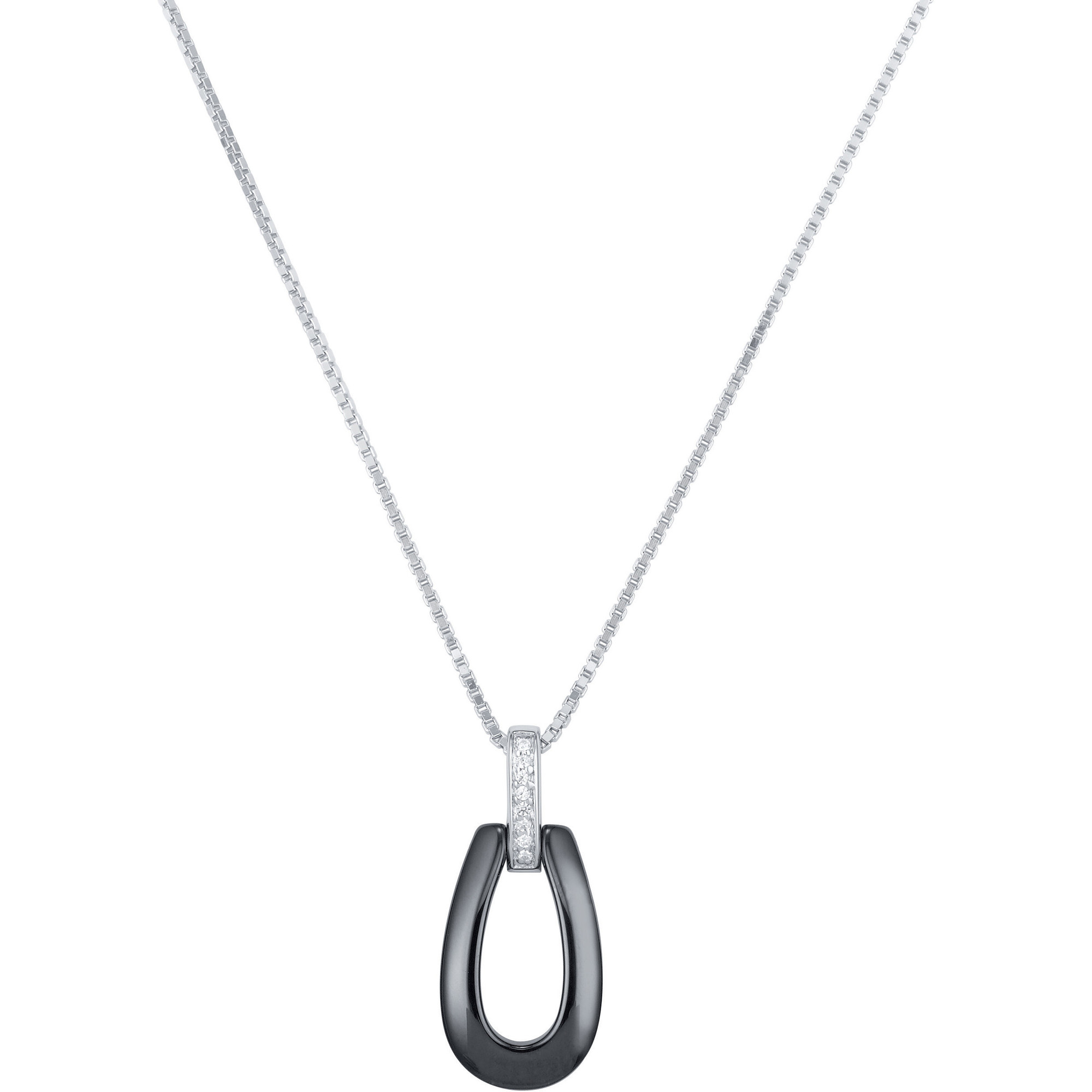Son pendentif en céramique noire, douce et lumineuse, contraste avec la brillance des oxydes de zirconium sertis sur une attache en argent 925 rhodié.