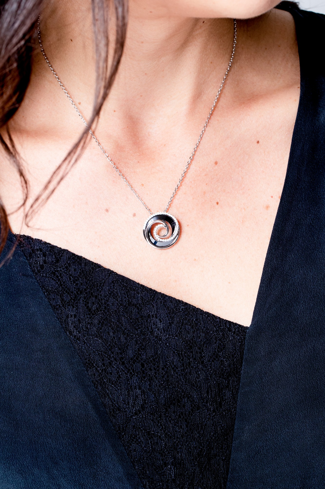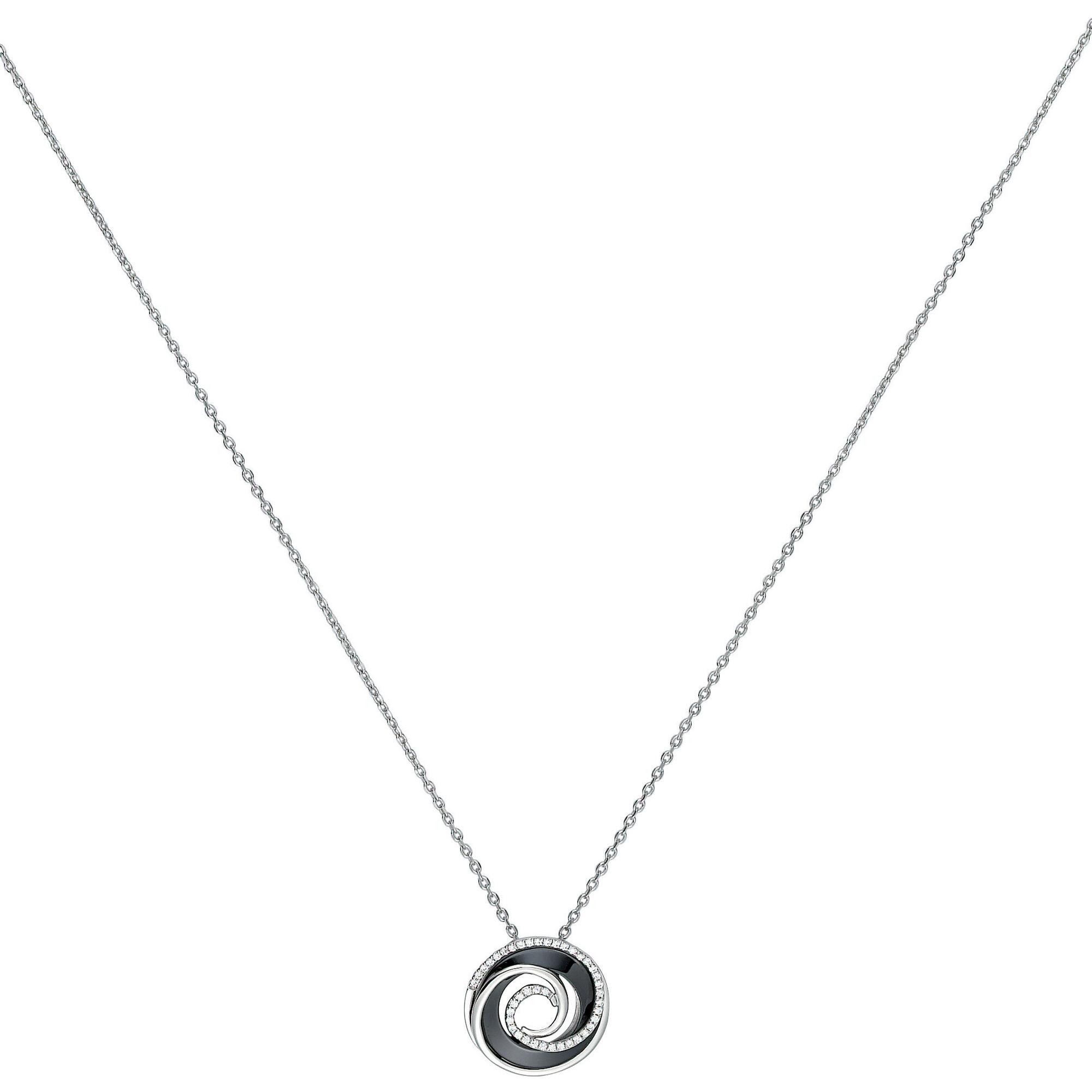 Son pendentif circulaire en céramique noire est rehaussé d’un délicat contour d’oxydes de zirconium, qui capte la lumière à chaque mouvement.