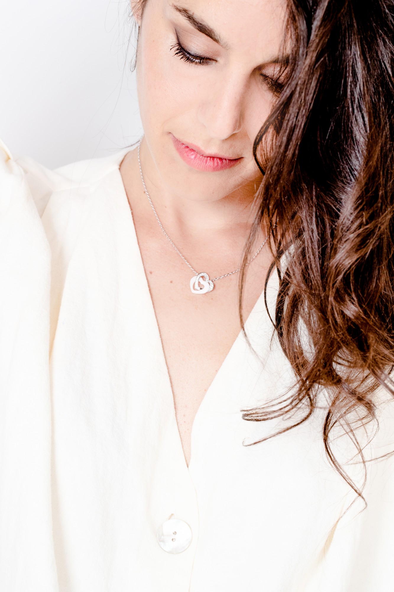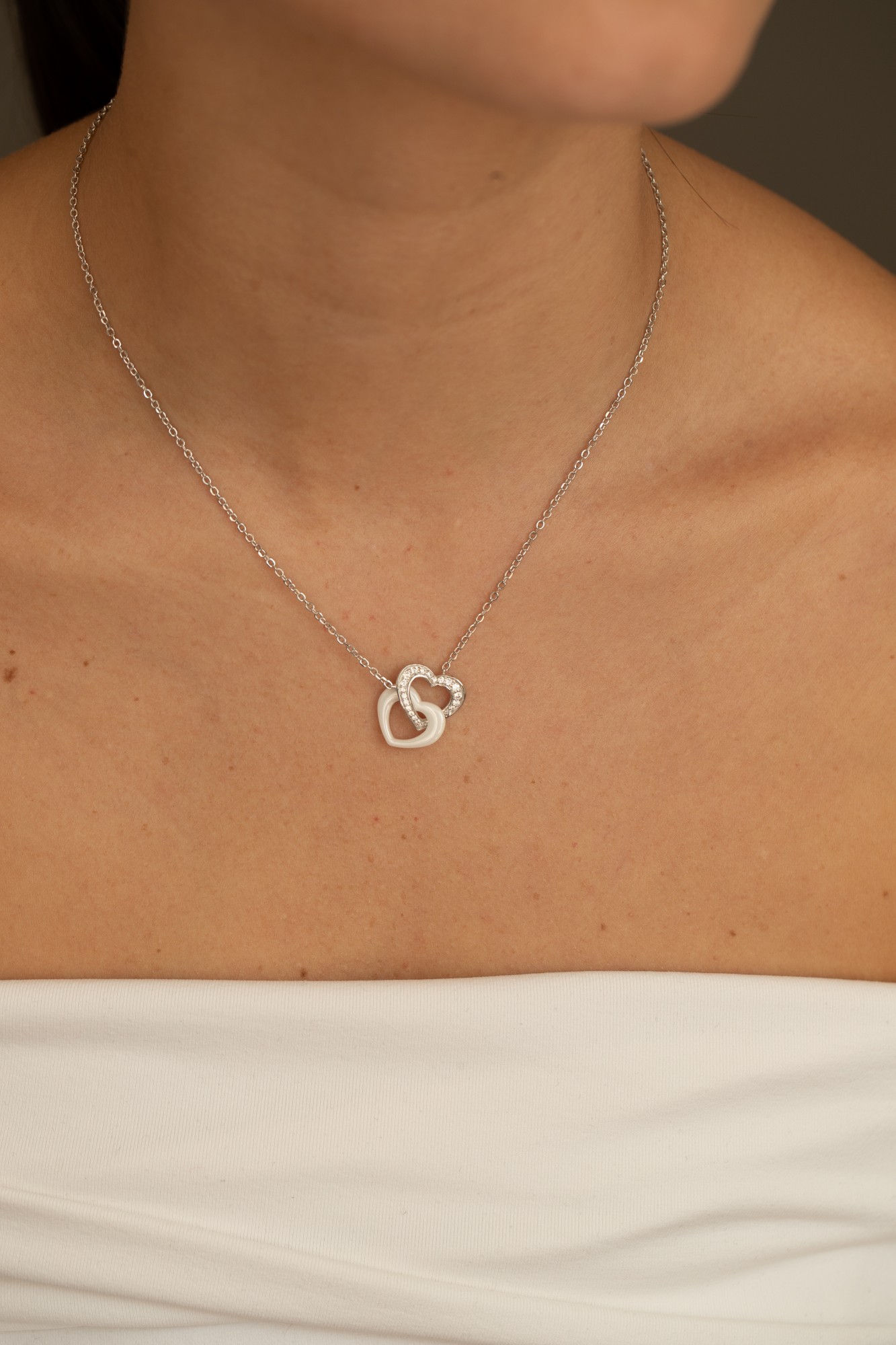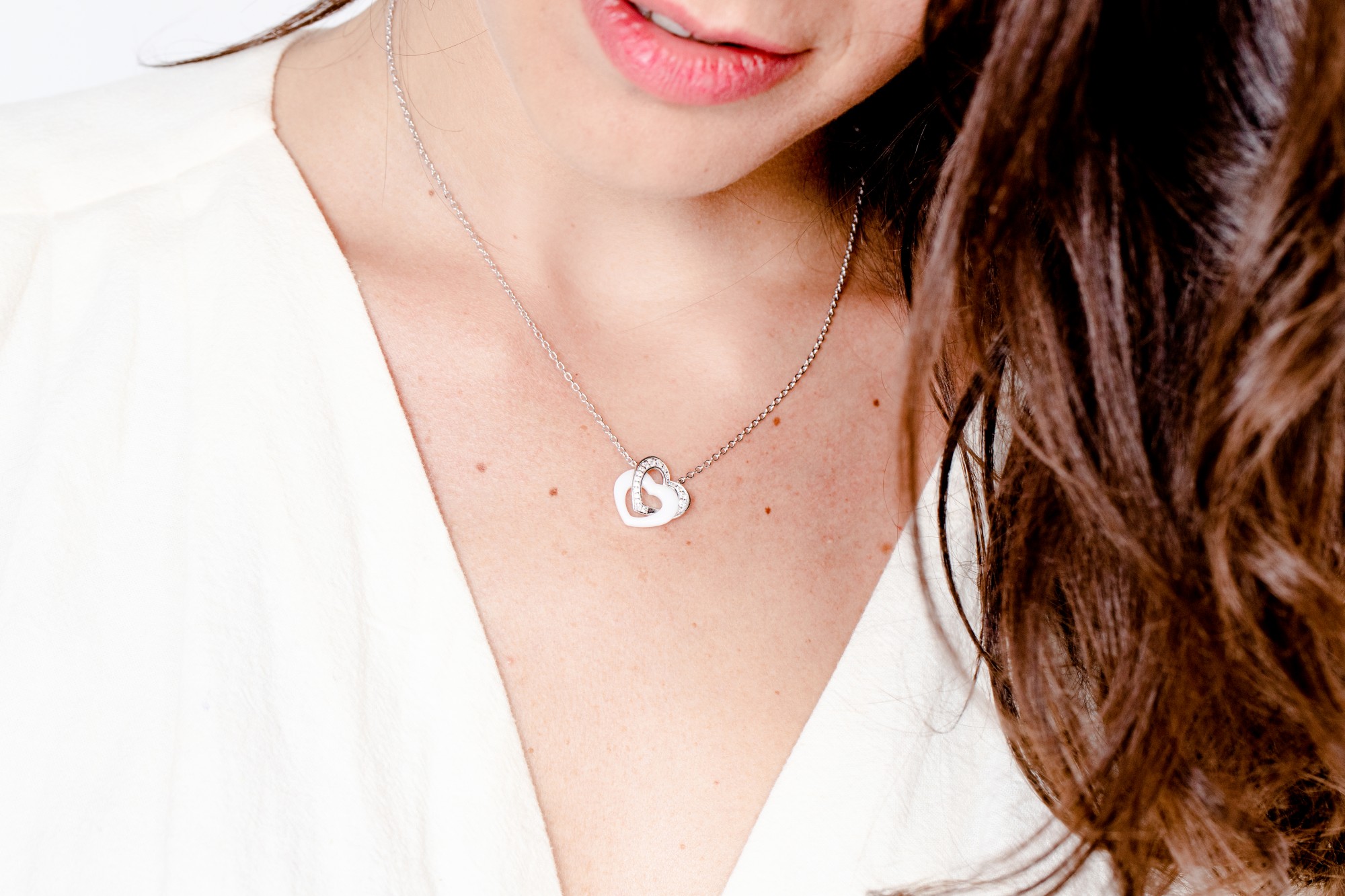 Deux cœurs entrelacés, l’un en céramique blanche, l’autre en argent 925 rhodié serti d’oxydes de zirconium, symbolisent un lien précieux et lumineux.