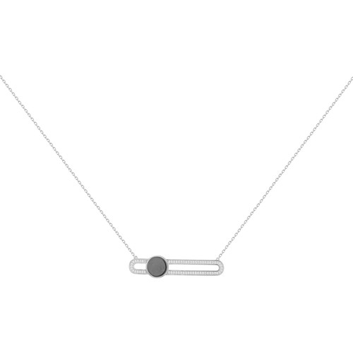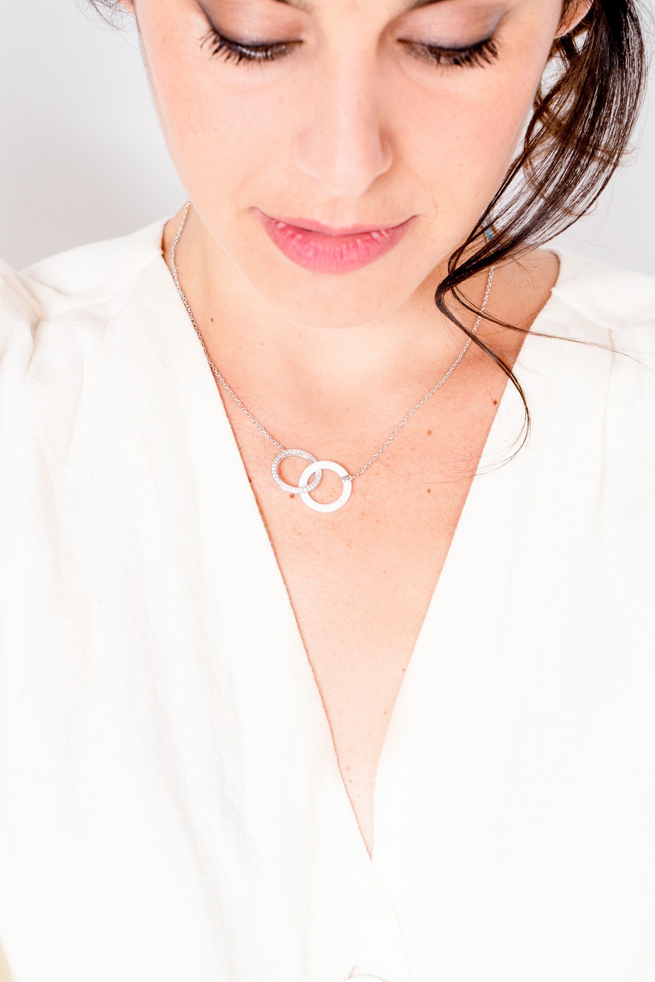 Deux anneaux entrelacés — l’un en céramique blanche, l’autre en argent 925 rhodié serti d’oxydes de zirconium — composent un pendentif au design équilibré et lumineux.