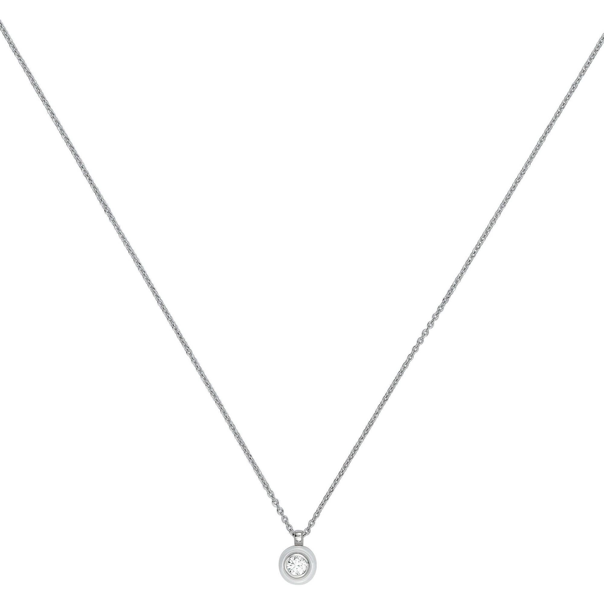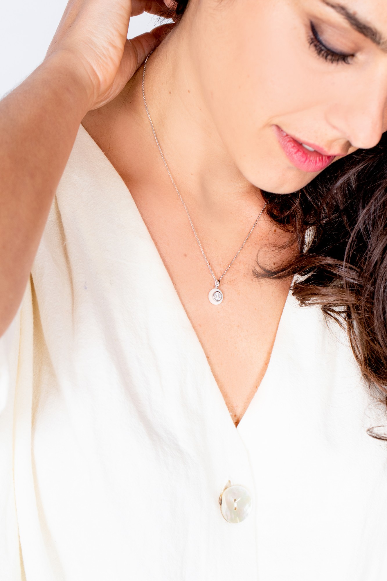Son pendentif rond en céramique blanche encadre un oxyde de zirconium délicatement serti dans un cercle d’argent 925 rhodié.