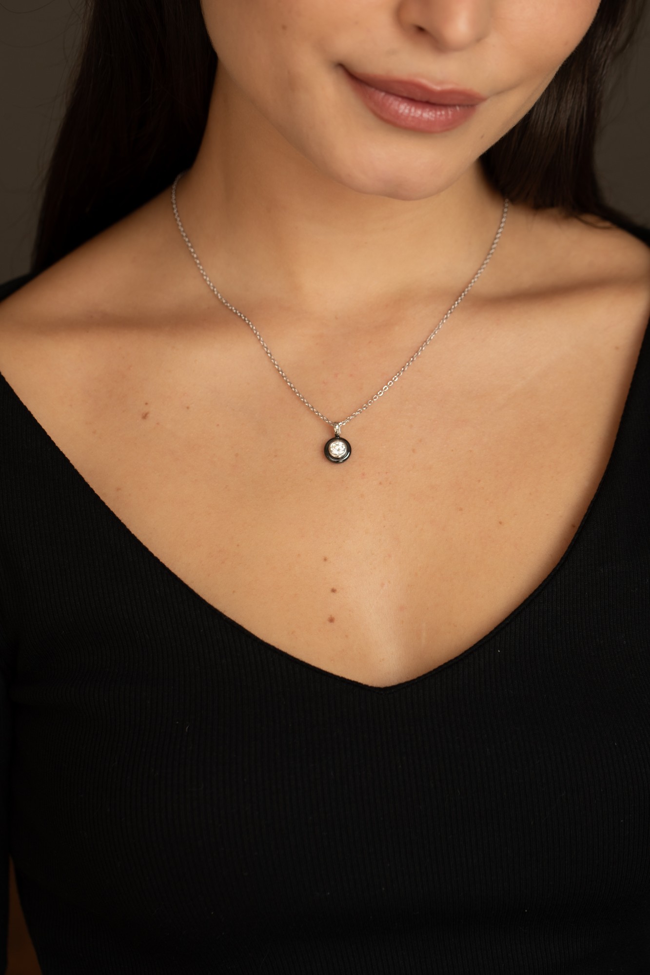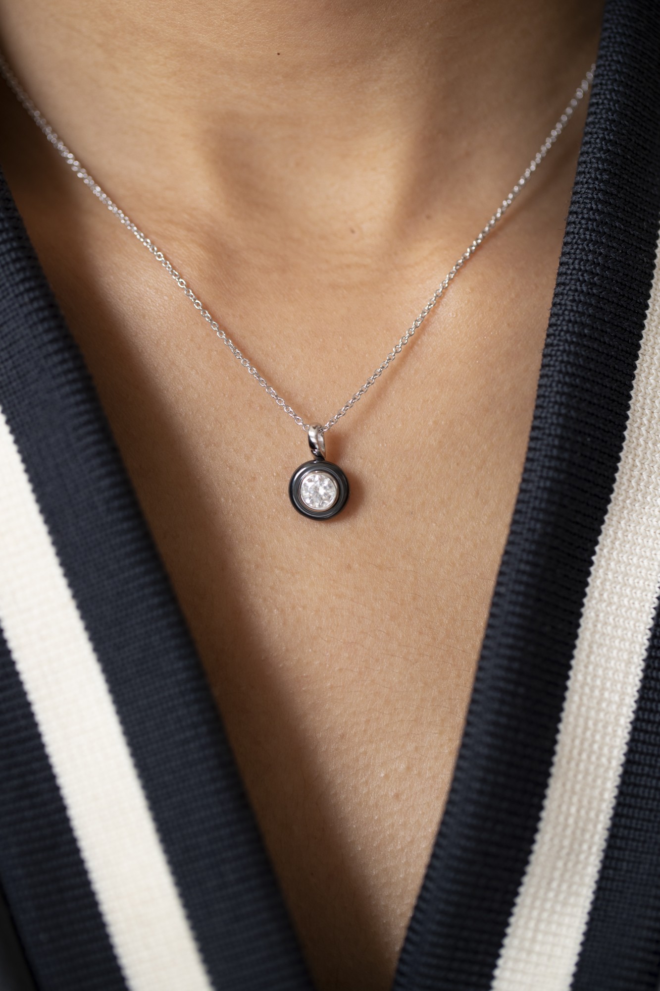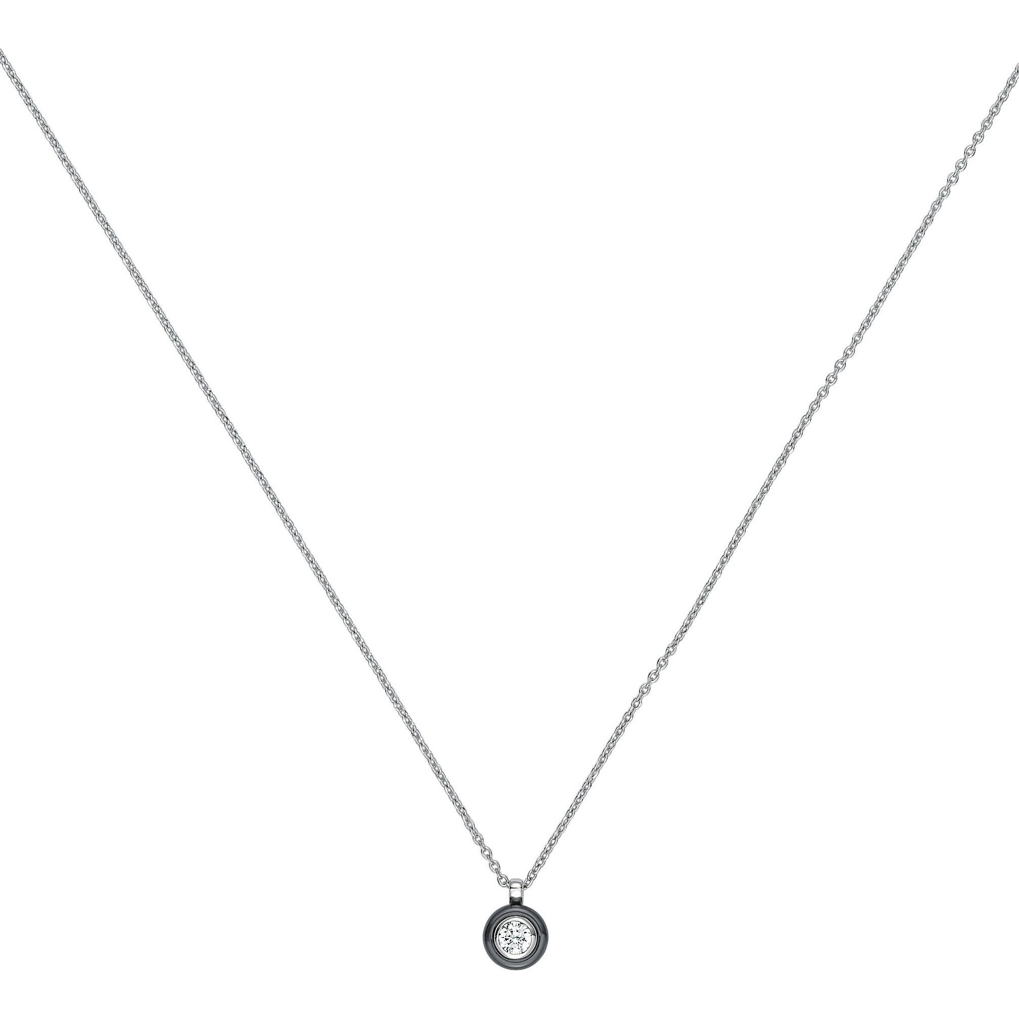 Son pendentif rond en céramique noire met en valeur un oxyde de zirconium serti dans un cercle d’argent 925 rhodié, jouant sur les contrastes entre intensité et éclat.