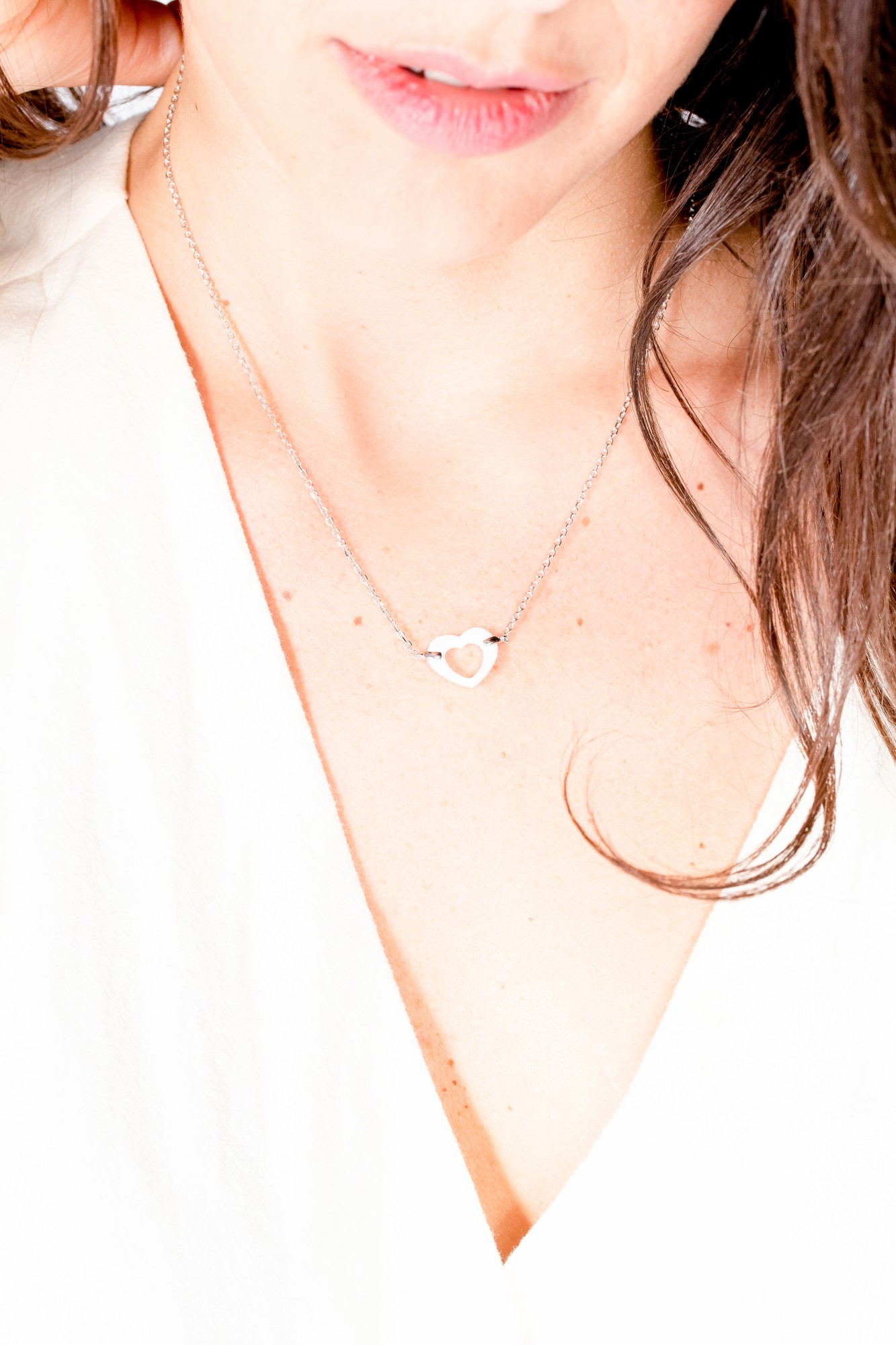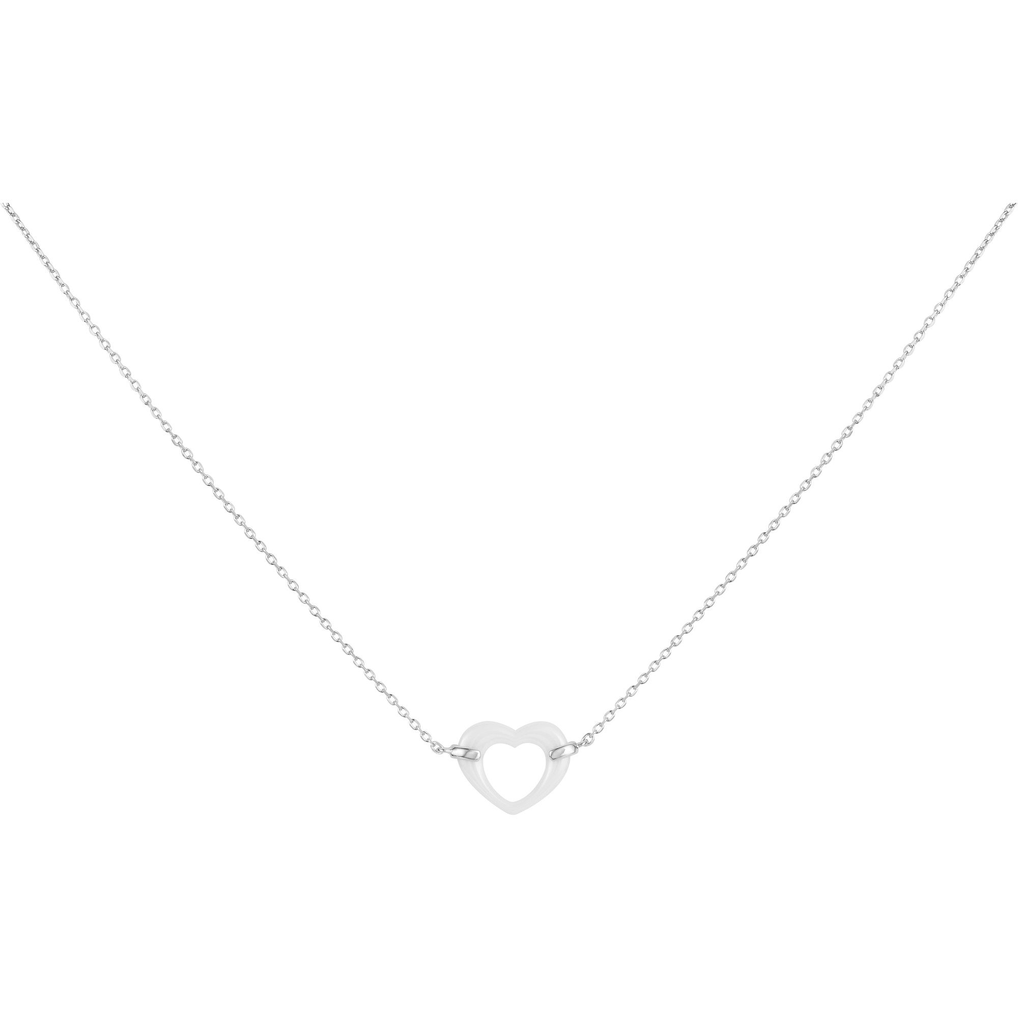 Le collier Frise séduit par la simplicité élégante de son cœur ajouré en céramique blanche, suspendu à une fine chaîne en argent 925 rhodié.