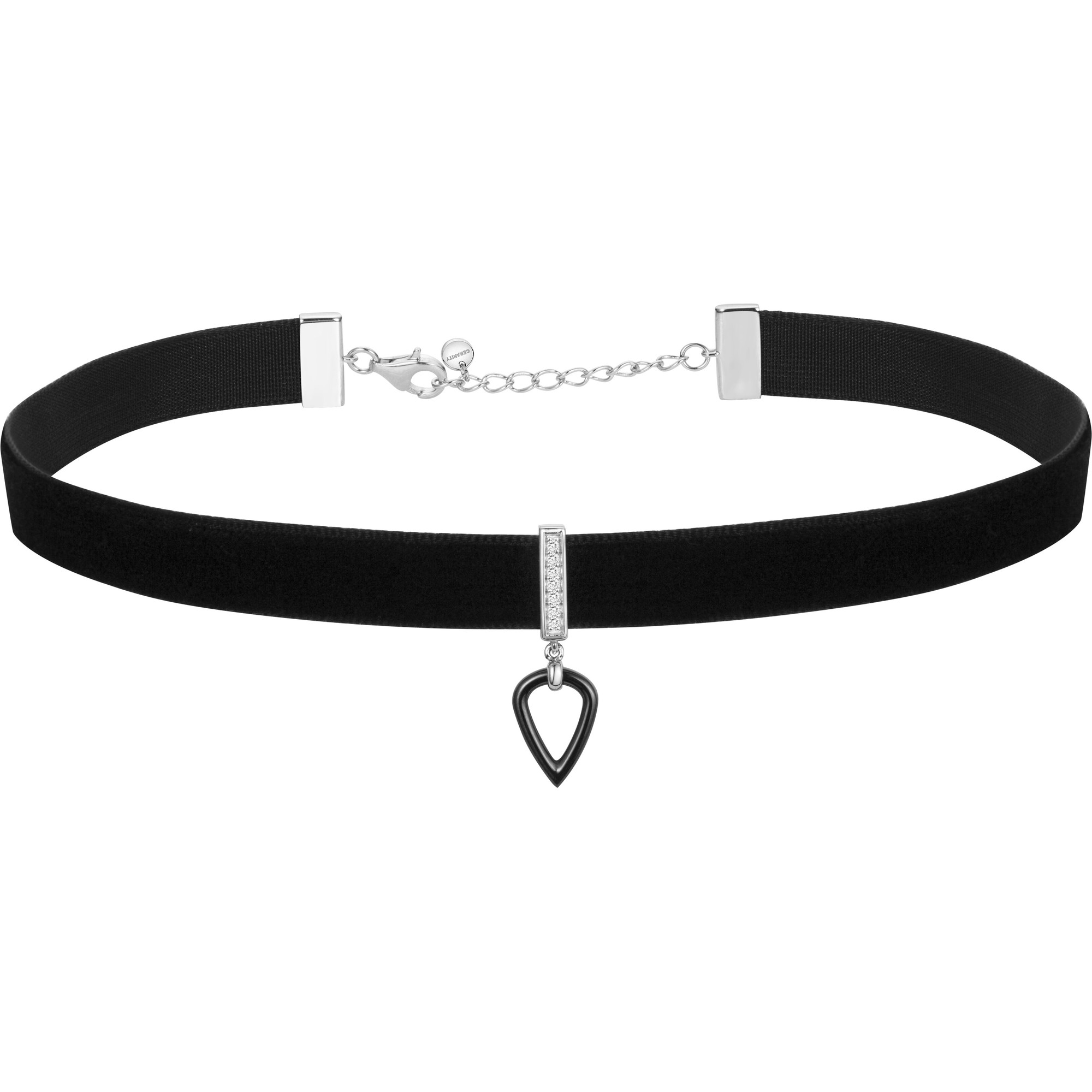 Suspendu à un ruban de velours noir, son pendentif cœur en céramique noire se distingue par son design épuré, souligné d’un pavage délicat d’oxydes de zirconium.