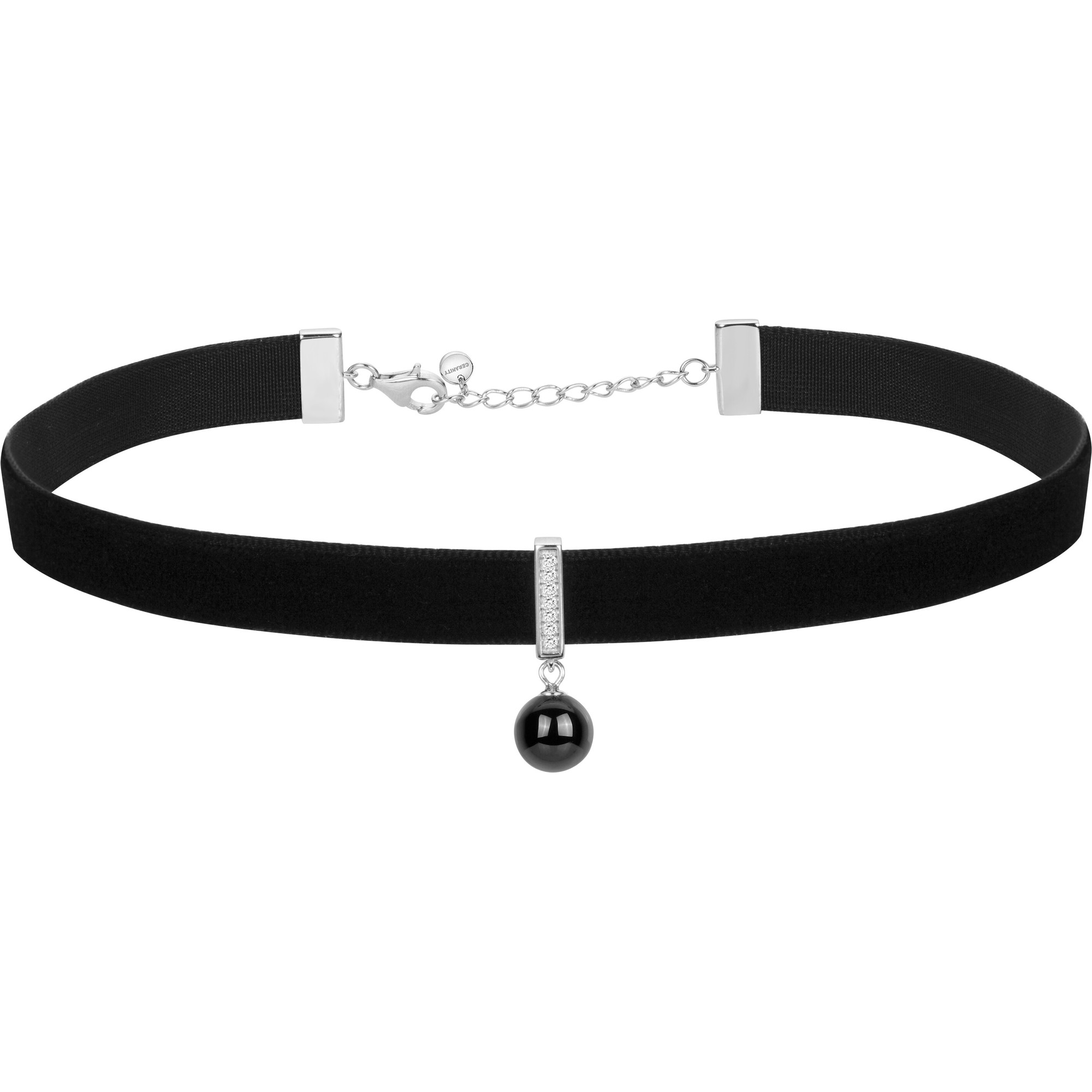 Son ruban de velours noir, doux et sensuel, met en valeur une perle de céramique noire suspendue à un pendentif serti d’oxydes de zirconium.
