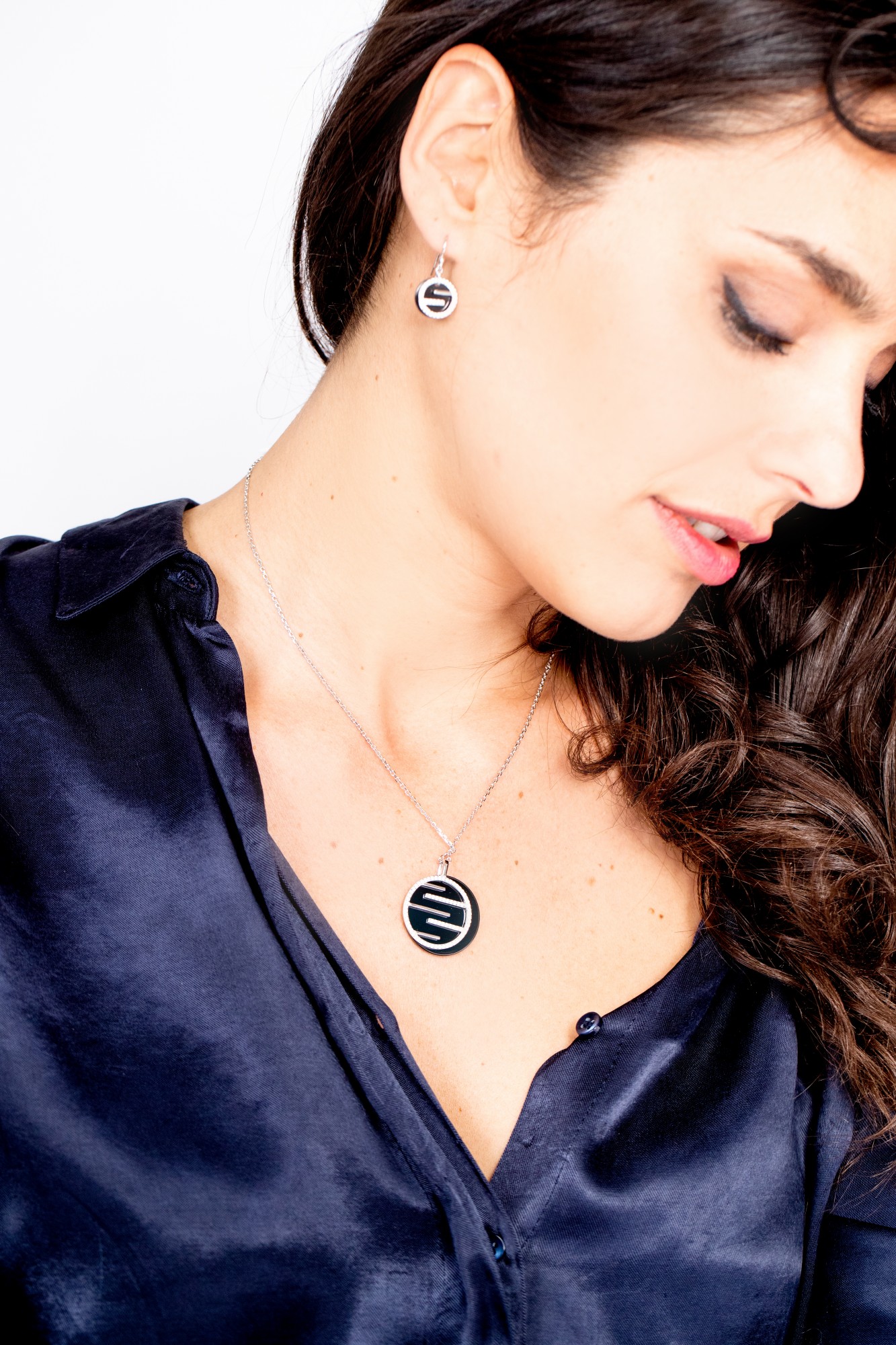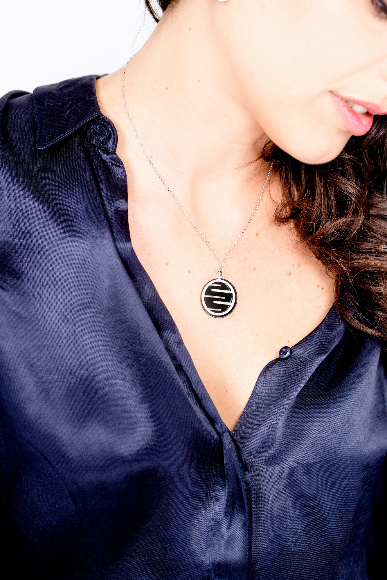 Son pendentif rond en céramique noire se distingue par ses lignes graphiques incrustées d’oxydes de zirconium, évoquant la chaleur maîtrisée d’une lumière qui brille sans éclat excessif.