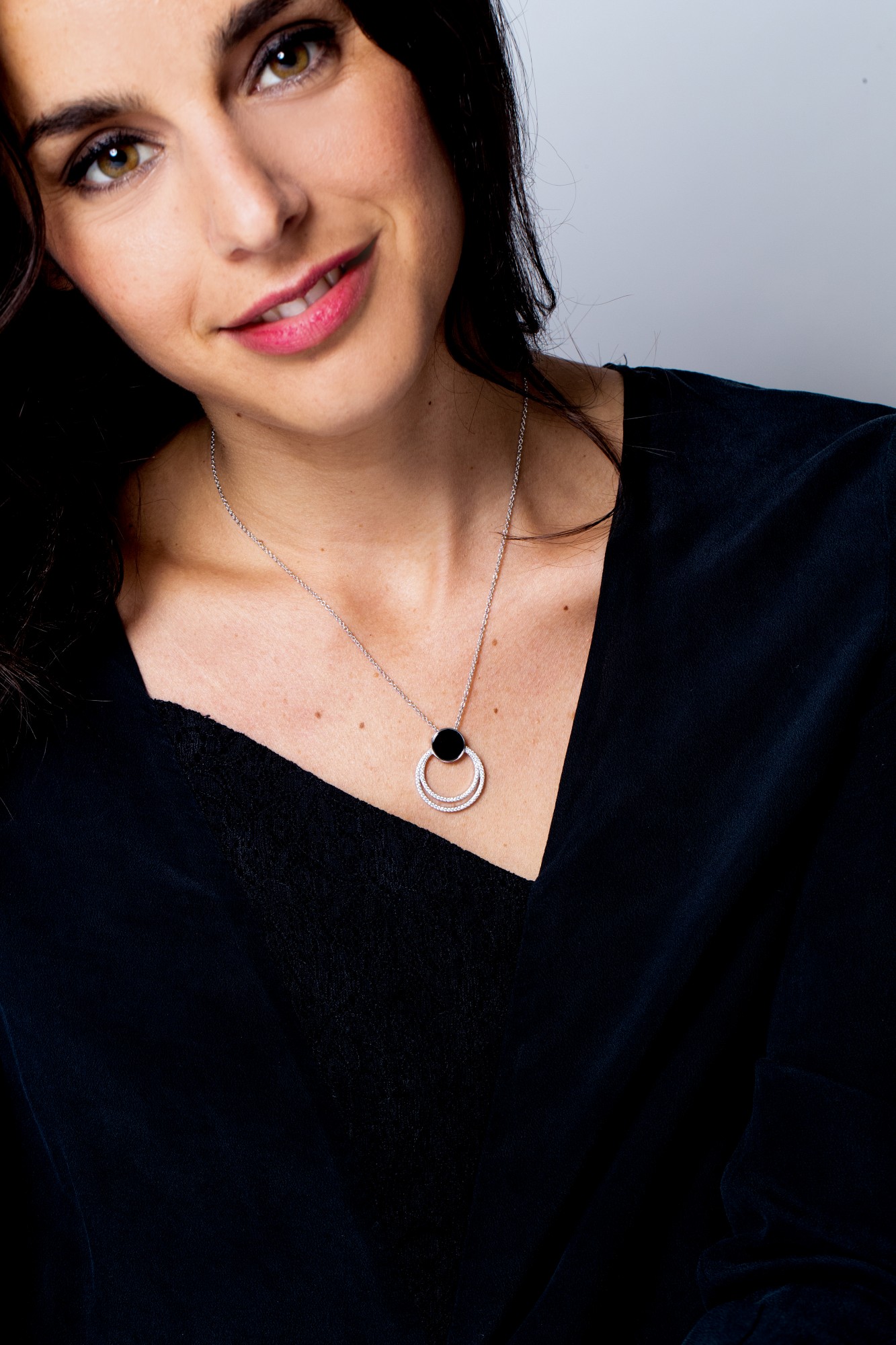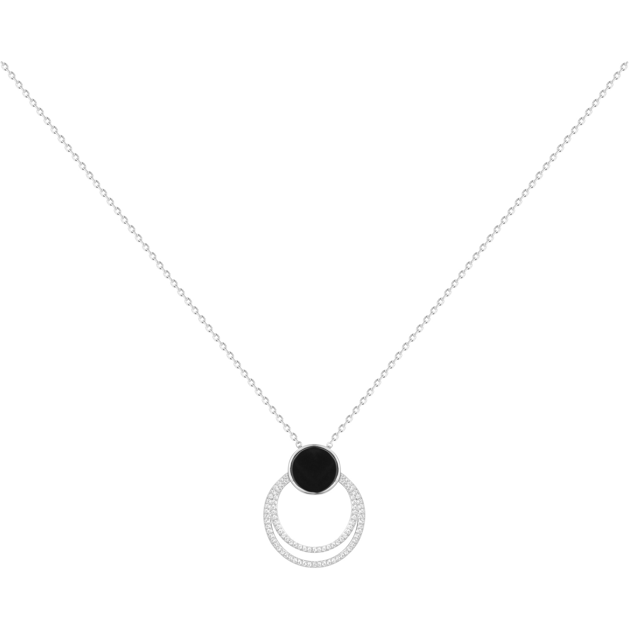 Son pendentif associe un disque en céramique noire à deux cercles pavés d’oxydes de zirconium, formant une composition délicate et équilibrée.