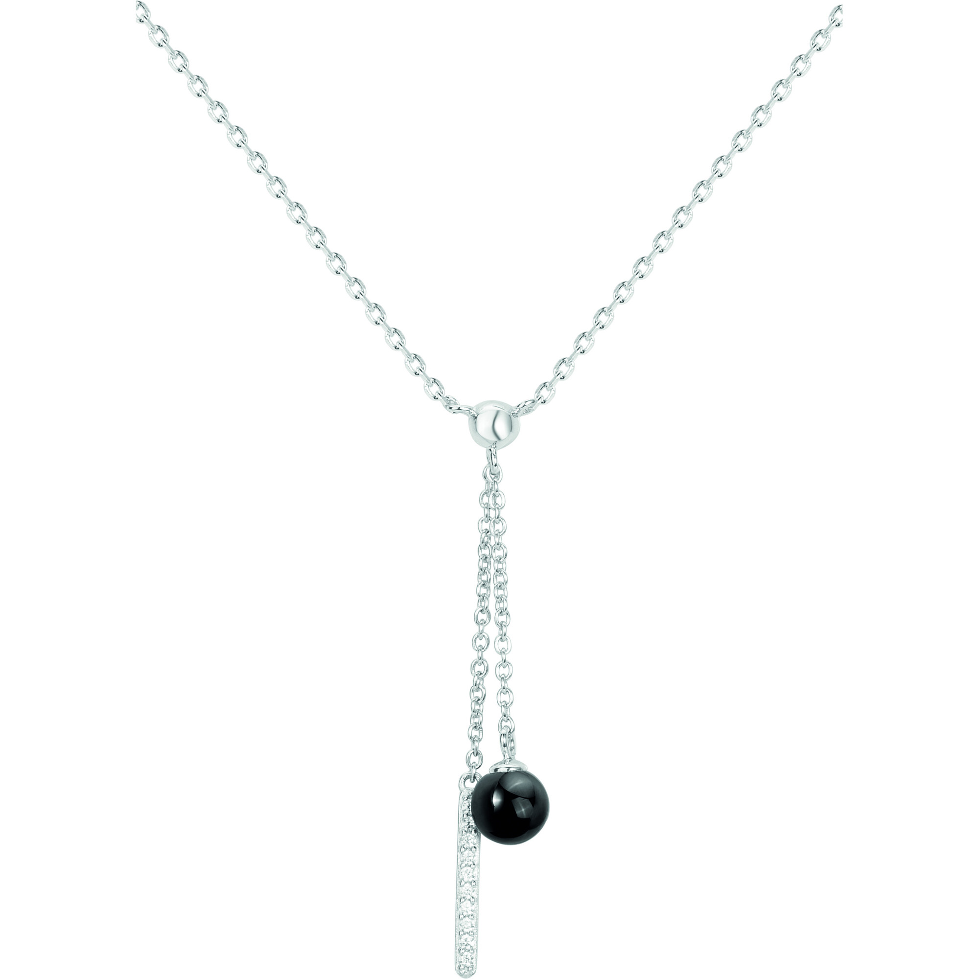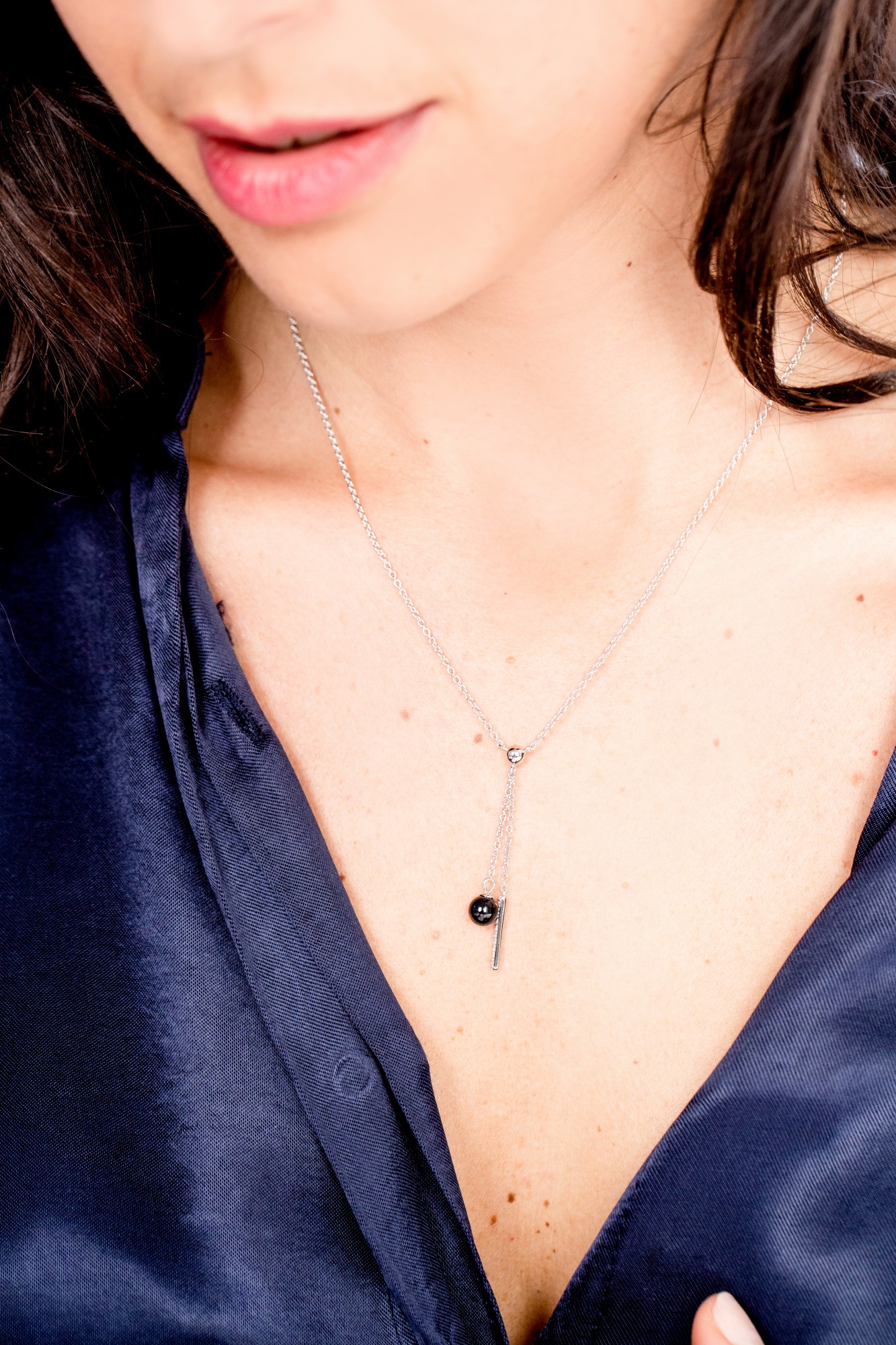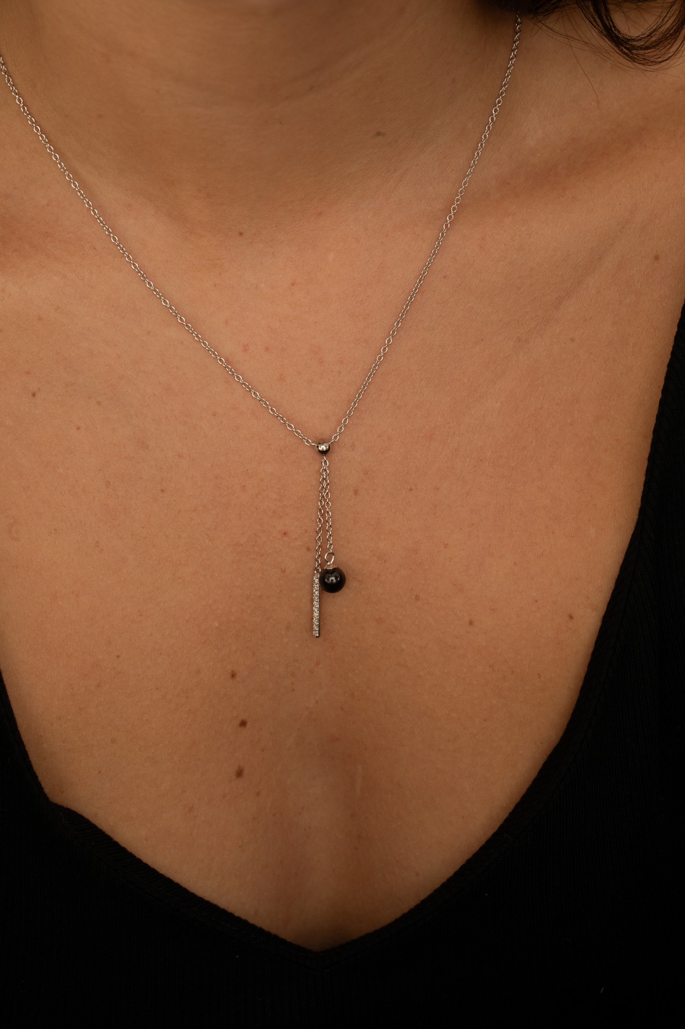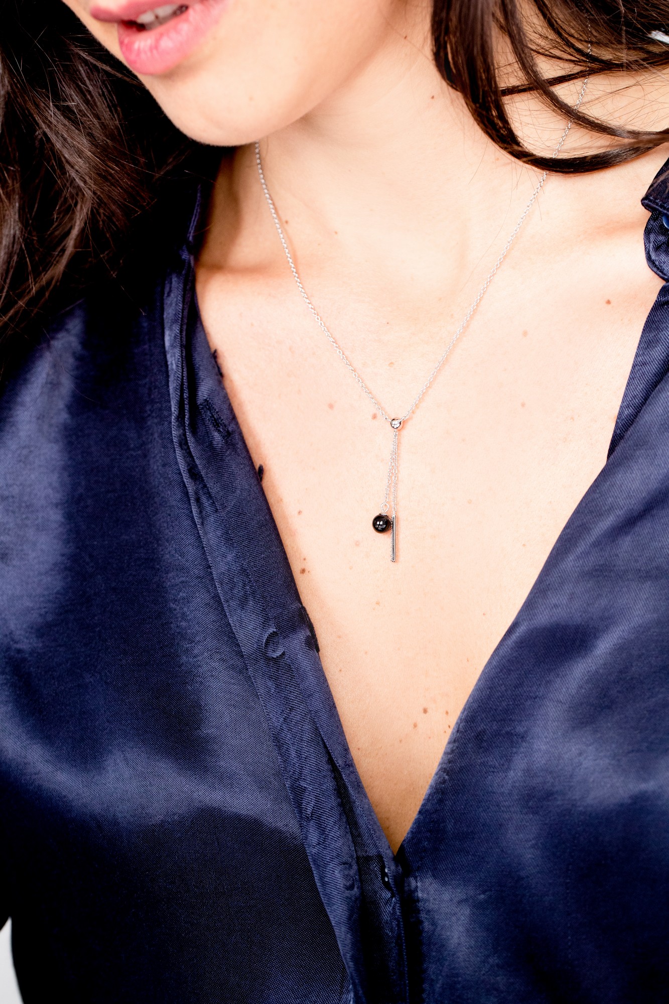 Suspendus à une fine chaîne en argent 925 rhodié, deux pendentifs se répondent : une sphère en céramique noire à la brillance profonde et une barre pavée d’oxydes de zirconium.