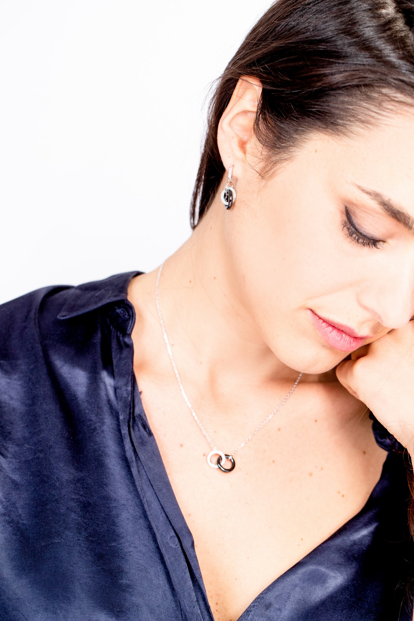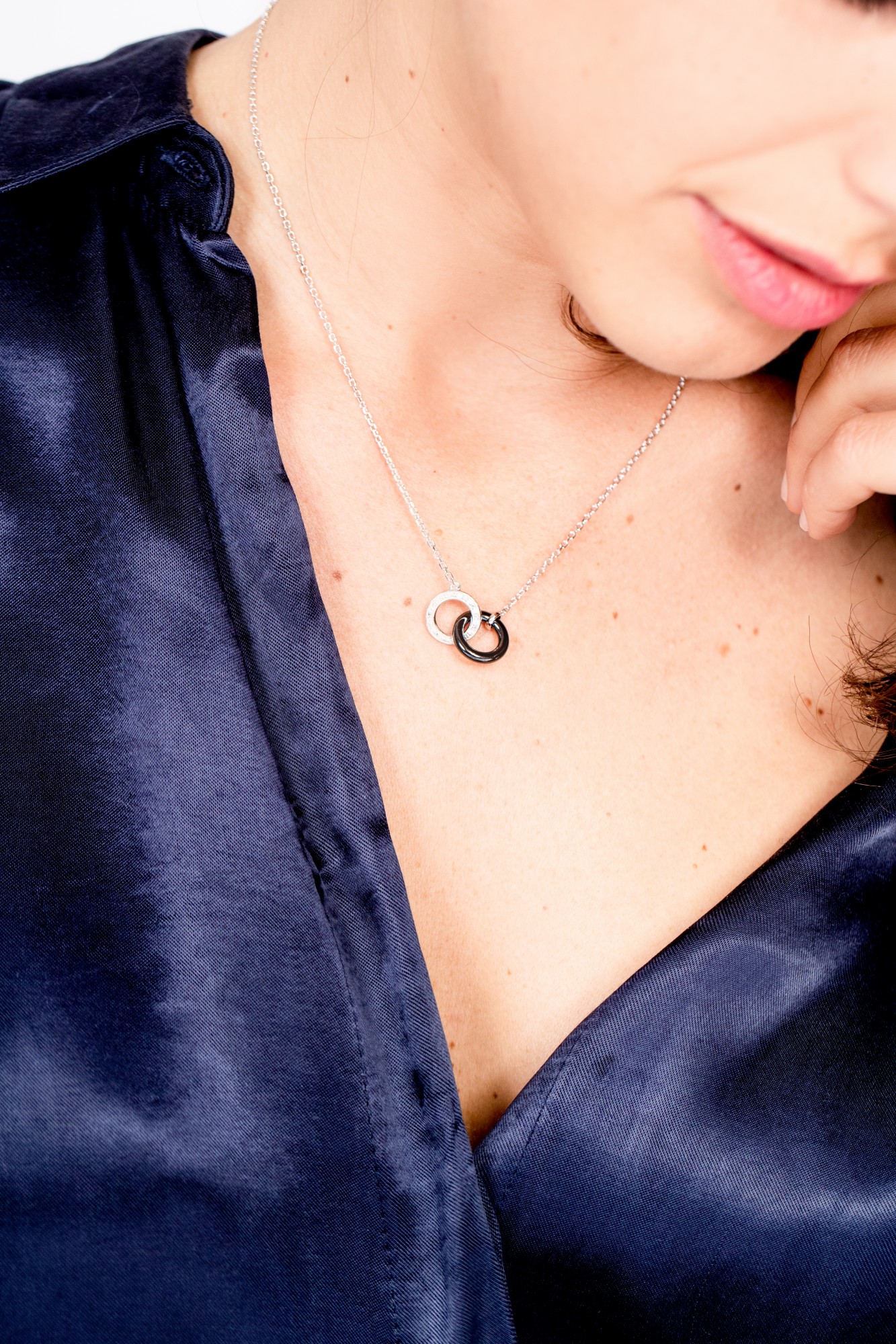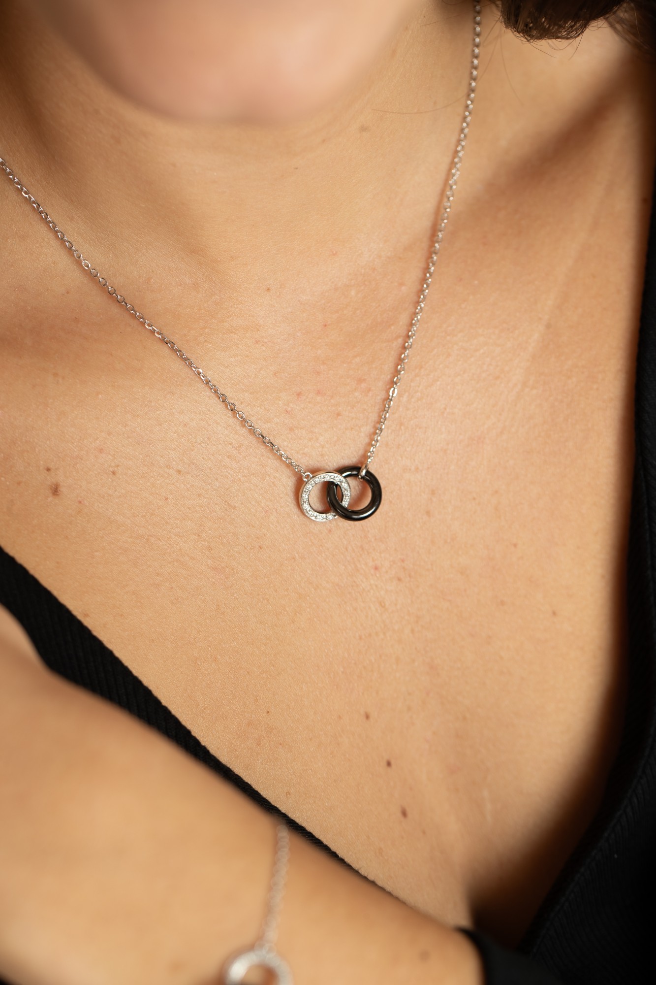 Deux anneaux entrelacés, l’un en céramique noire à la brillance profonde, l’autre en argent 925 rhodié serti d’oxydes de zirconium, symbolisent l’union et l’équilibre.