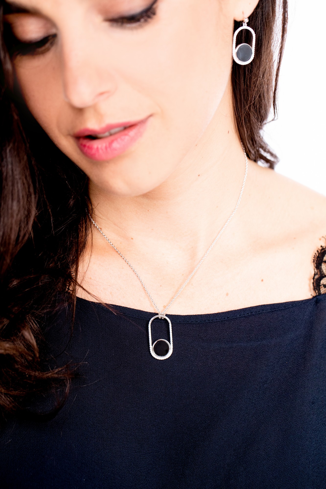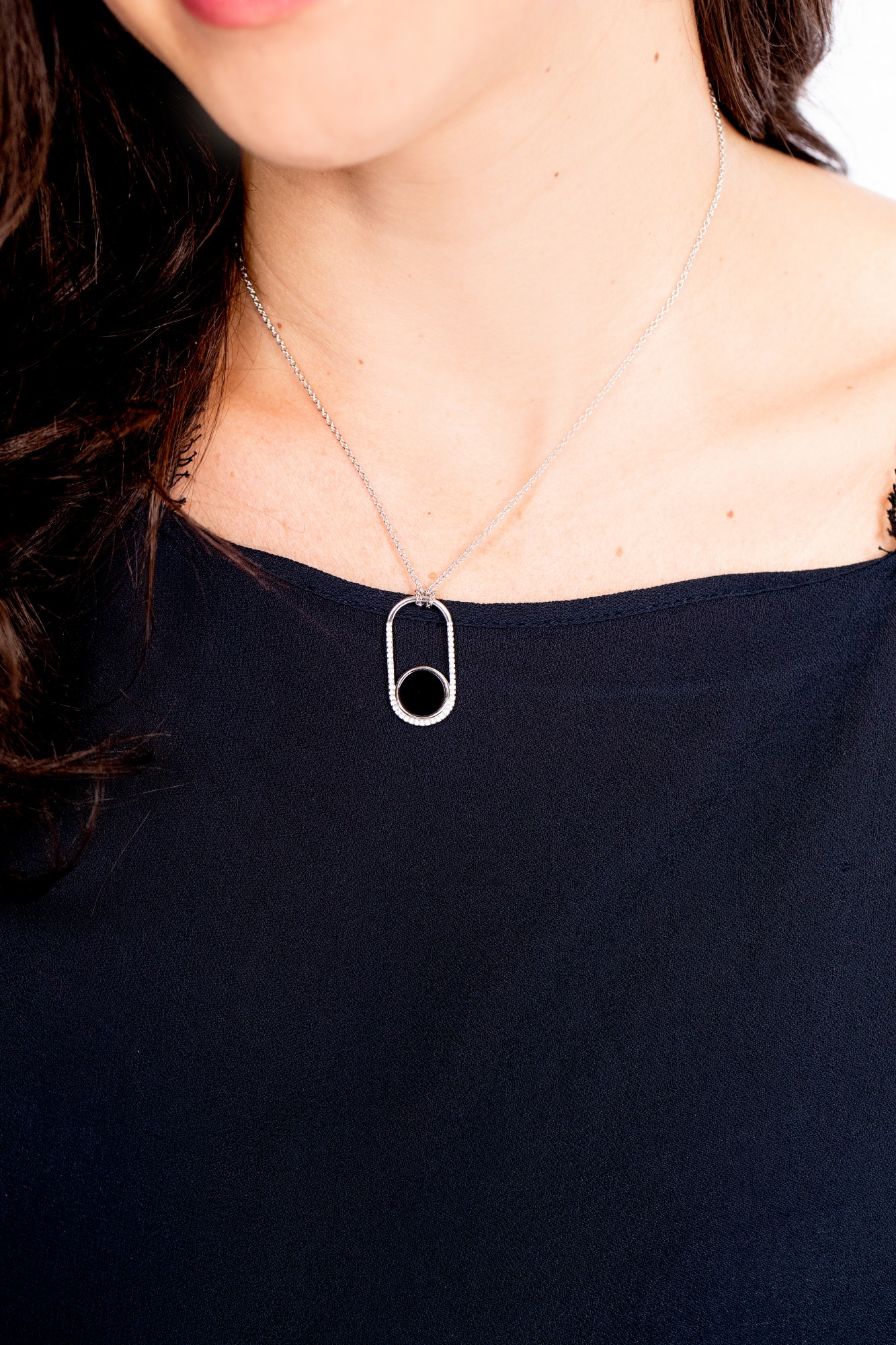 Son pendentif ovale, délicatement pavé d’oxydes de zirconium, encadre un médaillon en céramique noire au poli intense.