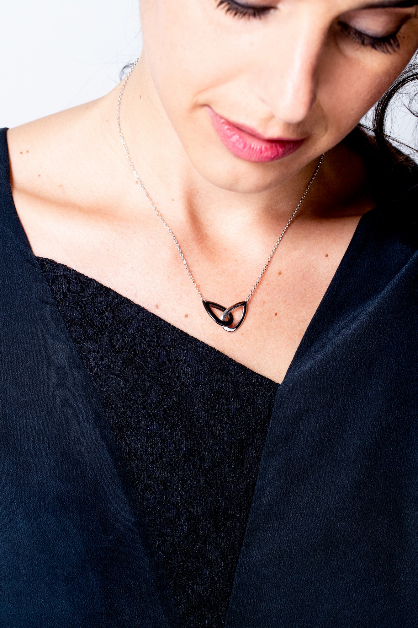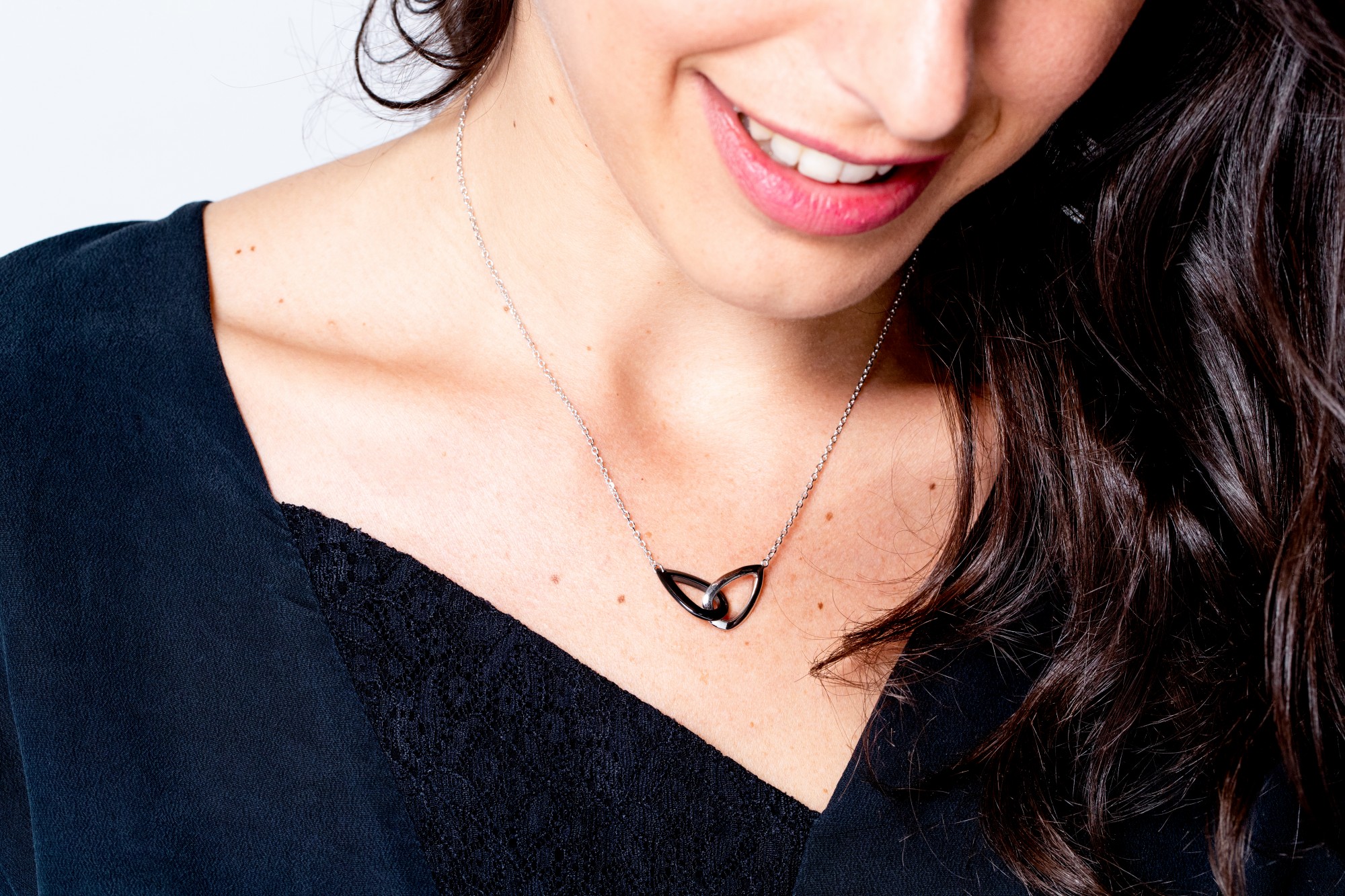 Deux formes ajourées, l’une en céramique noire, l’autre en céramique blanche, s’entrelacent dans un geste fluide, suspendues à une chaîne fine en argent 925 rhodié.