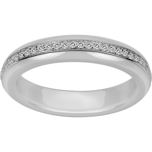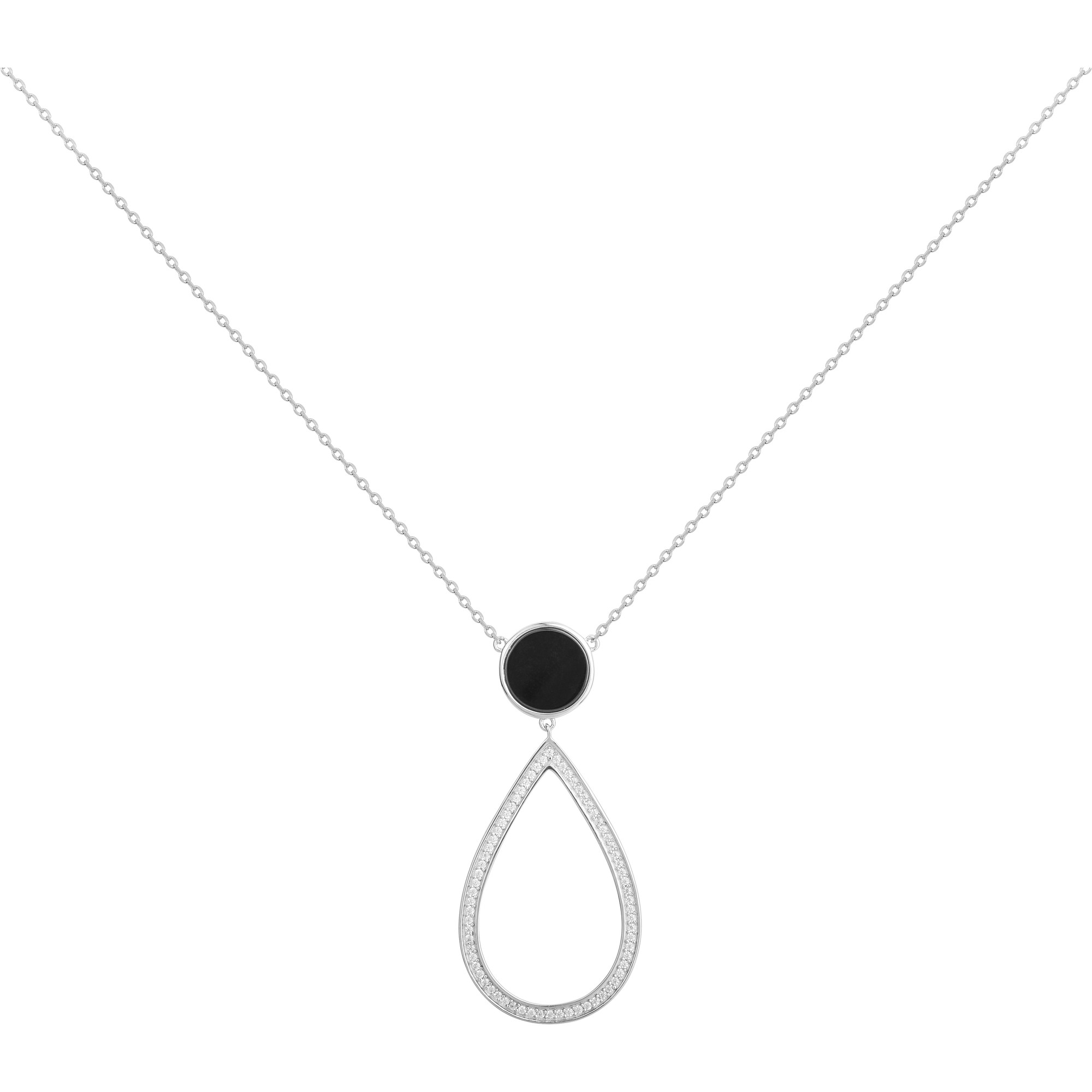Une goutte ajourée sertie d’oxydes de zirconium suspendue à un médaillon en céramique noire compose une silhouette aérienne et harmonieuse.