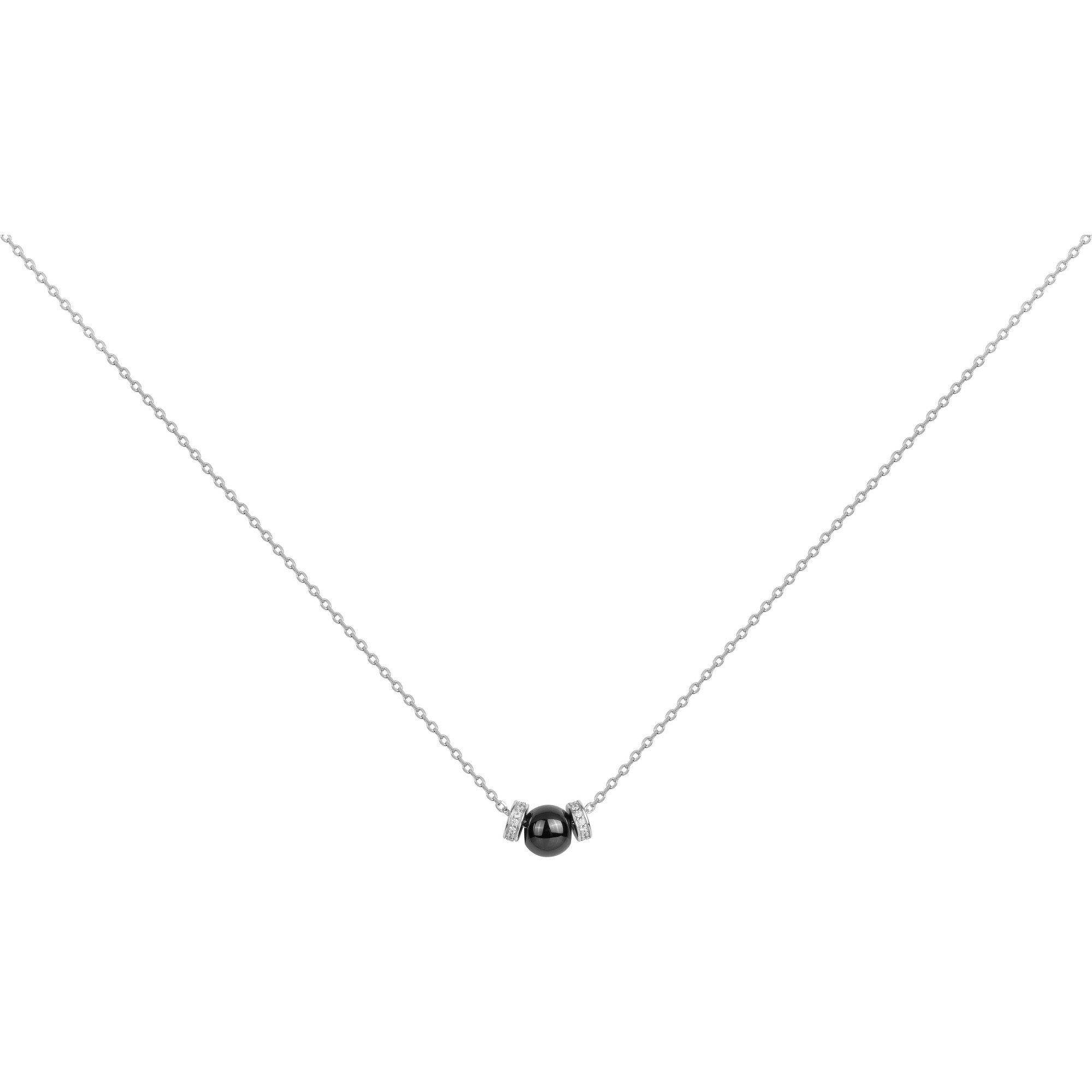 Au centre, une perle de céramique noire est encadrée de deux anneaux en argent 925 rhodié sertis d’oxydes de zirconium, dessinant un équilibre parfait entre pureté et éclat.