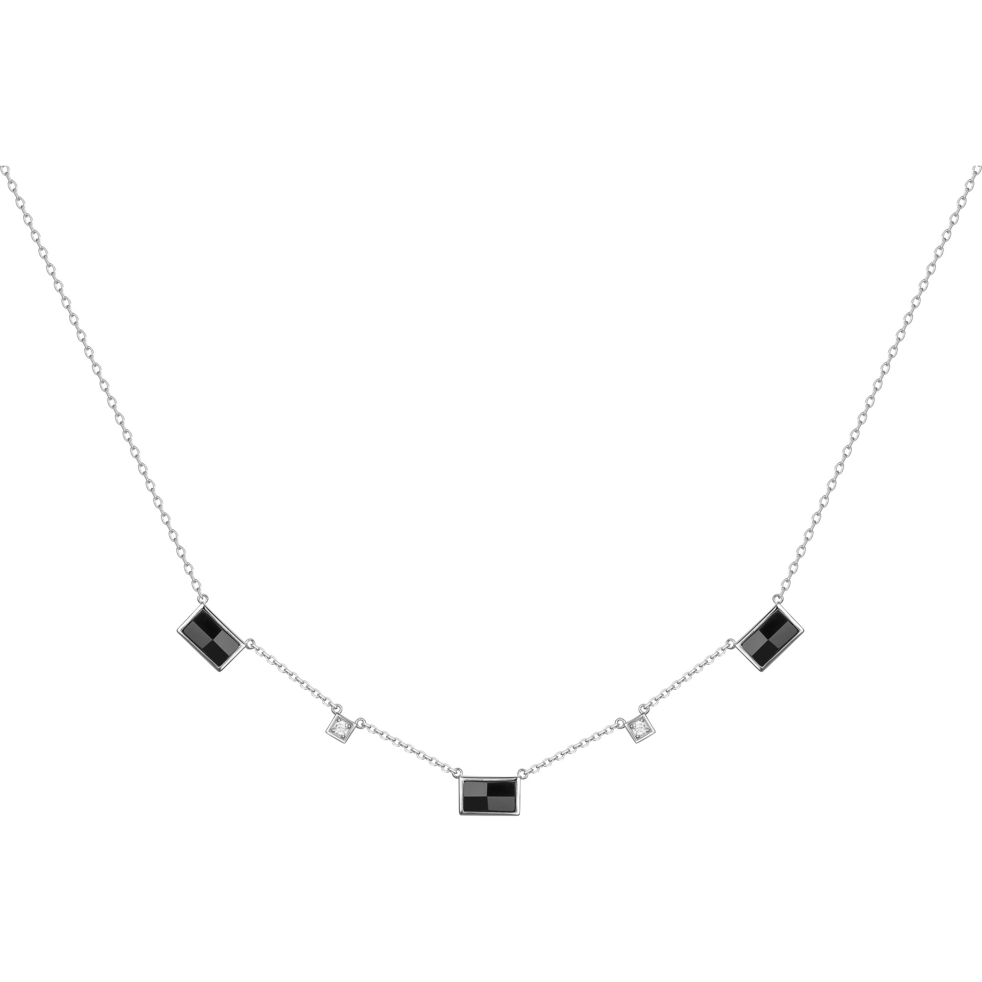 Le collier Quartz joue la carte de l’équilibre parfait entre modernité et éclat. Trois motifs rectangulaires en céramique noire à relief se succèdent sur une délicate chaîne en argent 925 rhodié, rehaussés de pierres lumineuses en oxyde de zirconium.