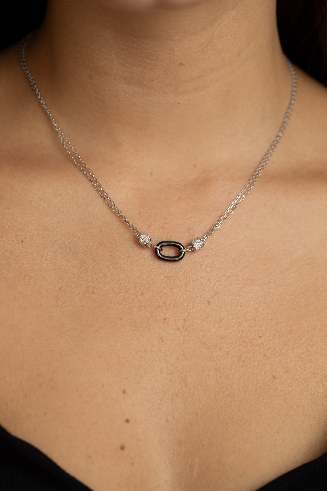 Le collier Neige allie contraste et modernité dans un design à la fois délicat et affirmé. En son centre, un maillon ovale en céramique noire lisse est encadré de deux cylindres sertis d’oxydes de zirconium, montés sur une double chaîne en argent 925 rhodié.