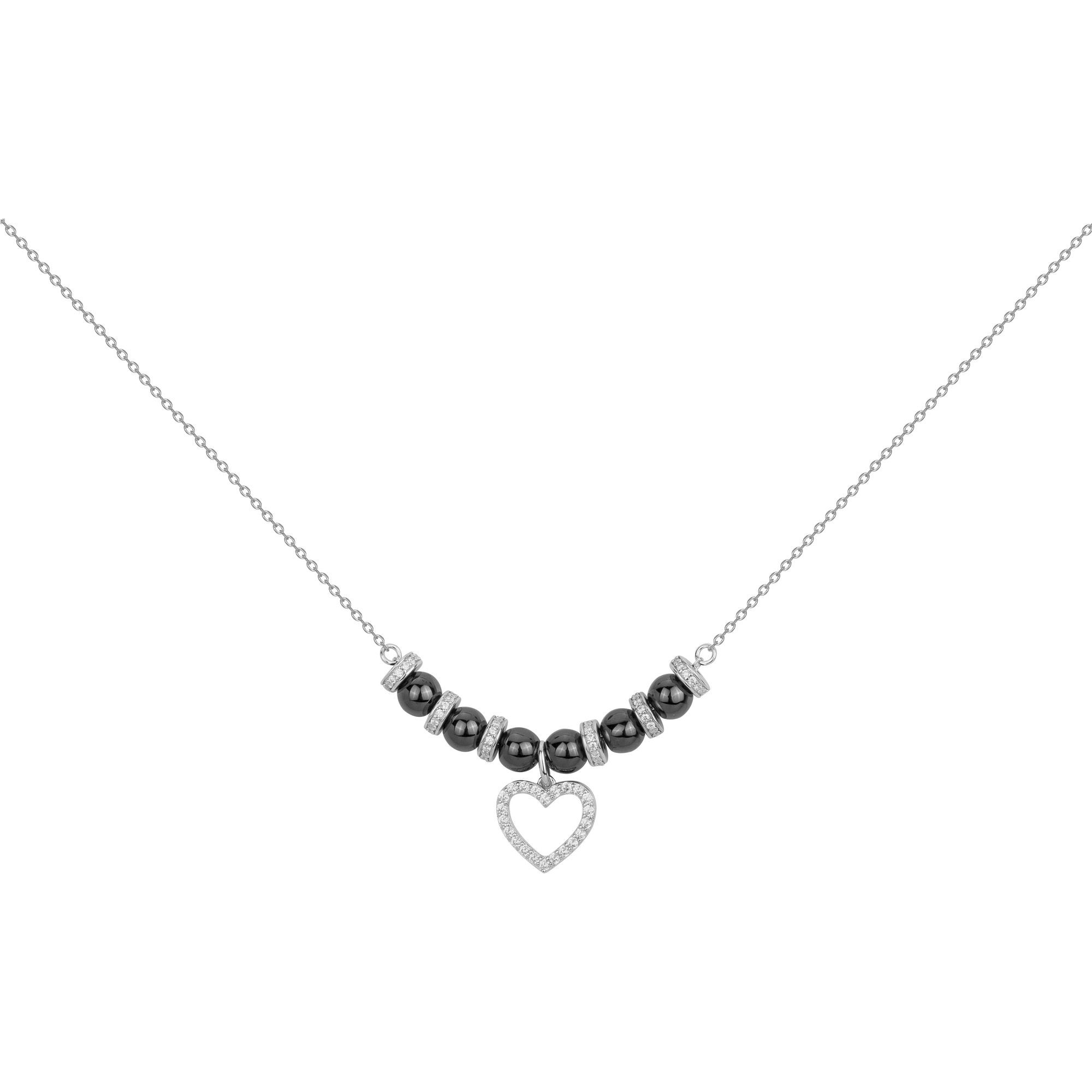Le collier Mystique mêle intensité et douceur dans une création à la fois élégante et symbolique. Composé de perles en céramique noire lustrée, encadrées d’anneaux d’argent 925 rhodié sertis d’oxydes de zirconium, il se distingue par son pendentif en forme de cœur ajouré, éclatant de lumière.