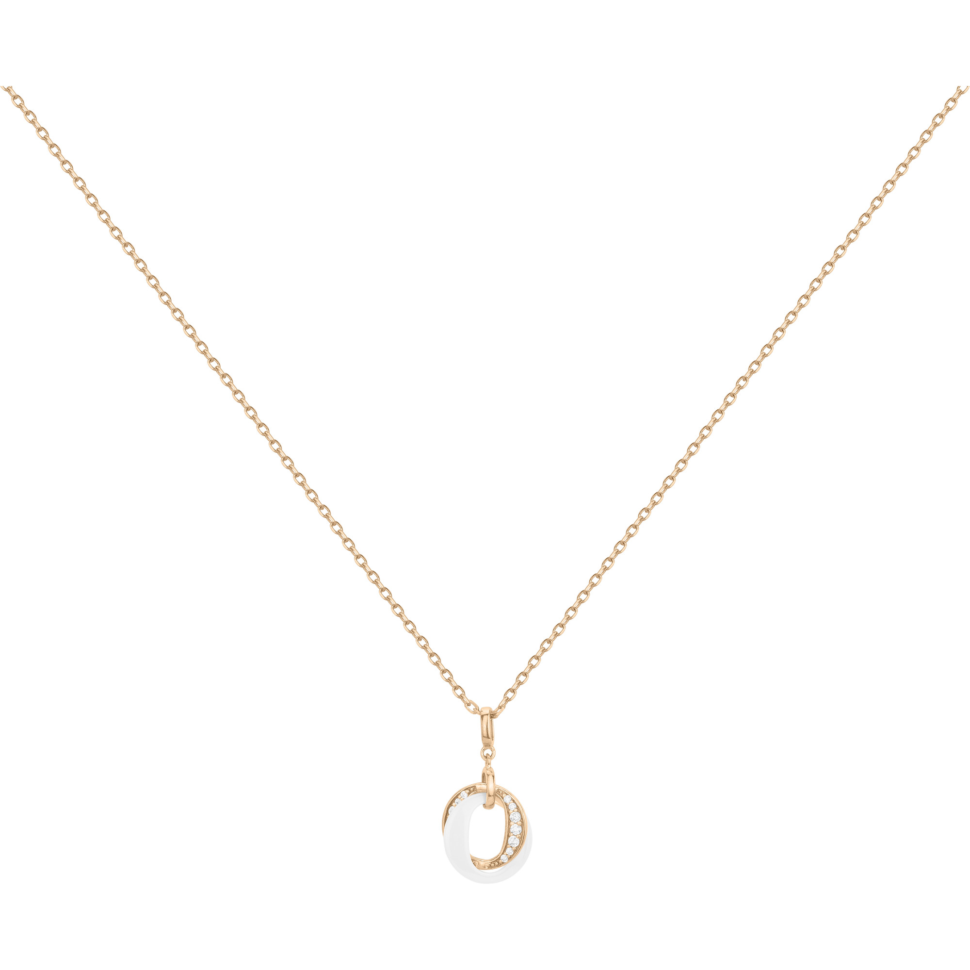 Deux anneaux s’entrelacent : l’un en plaqué or 18 carats sublimé par une ligne d’oxydes de zirconium, l’autre en céramique blanche lisse, symbole de pureté et de douceur.