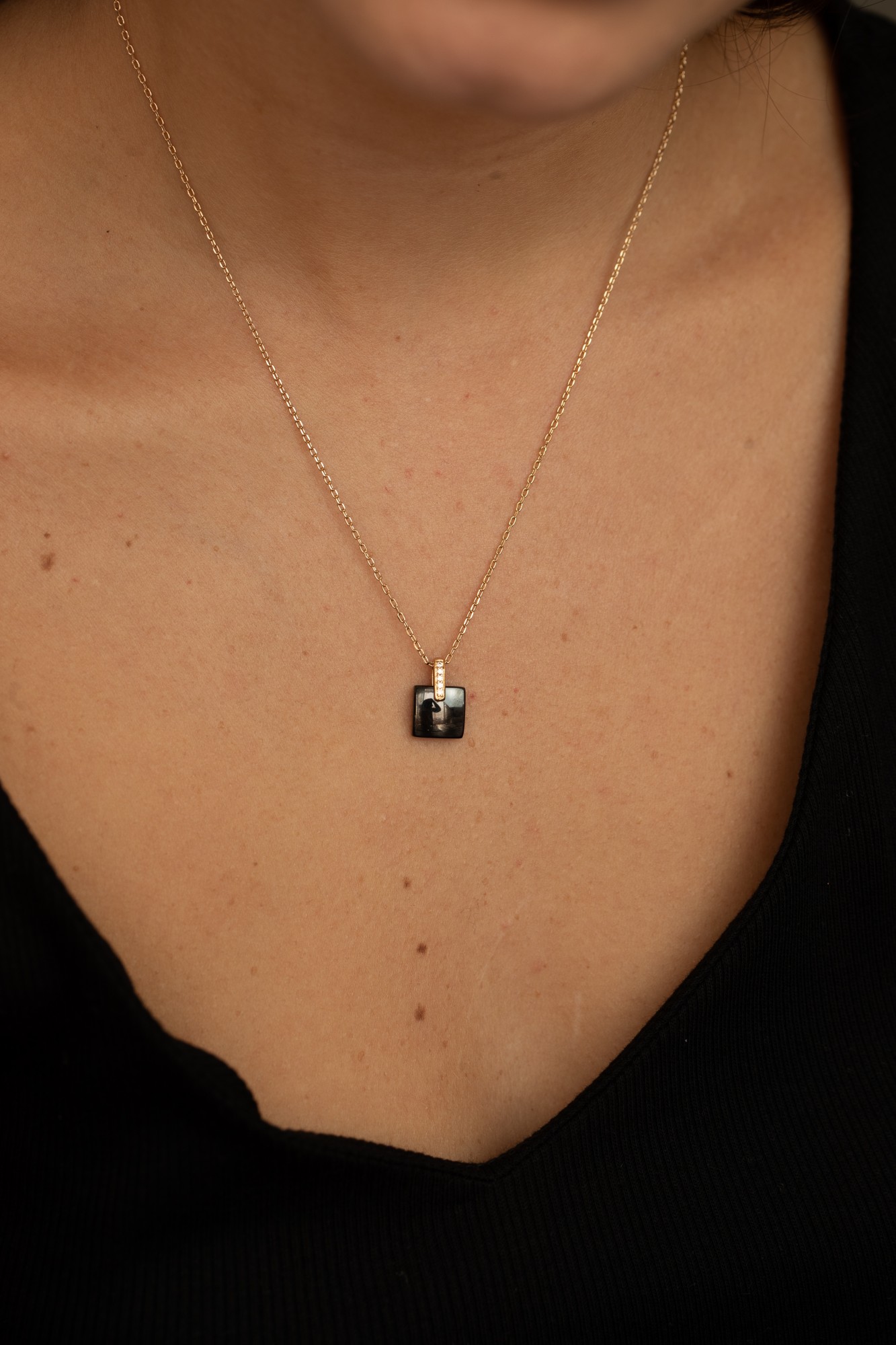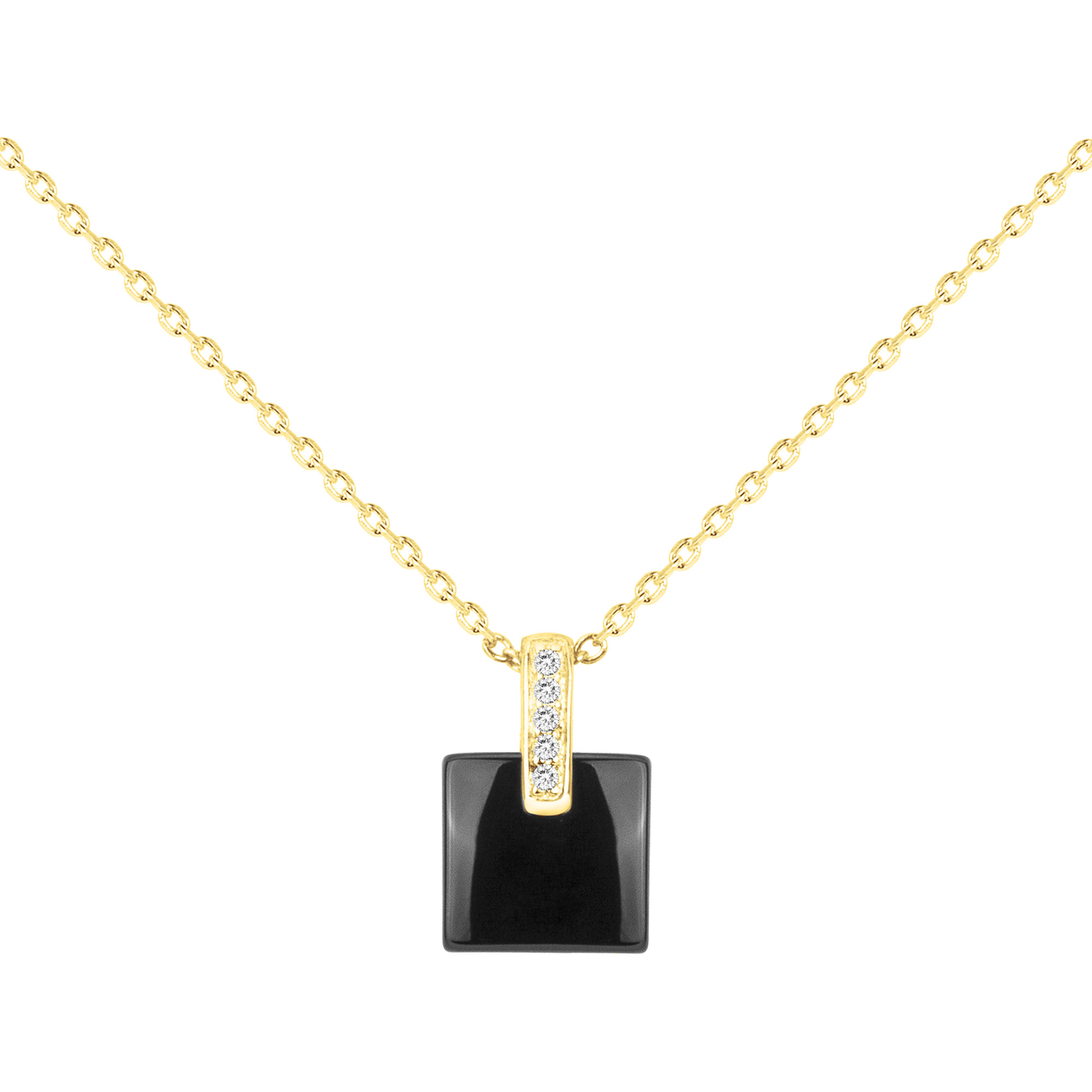 Le collier Carafe reflète la force du contraste entre l’éclat du plaqué or 18 carats et la profondeur de la céramique noire lisse.