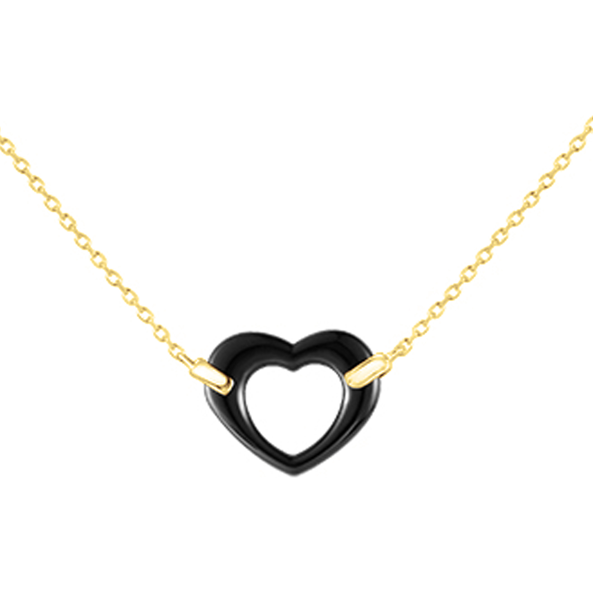 Son pendentif ajouré en céramique noire lisse, suspendu à une chaîne en plaqué or 18 carats, joue sur la dualité entre éclat doré et profondeur mate.