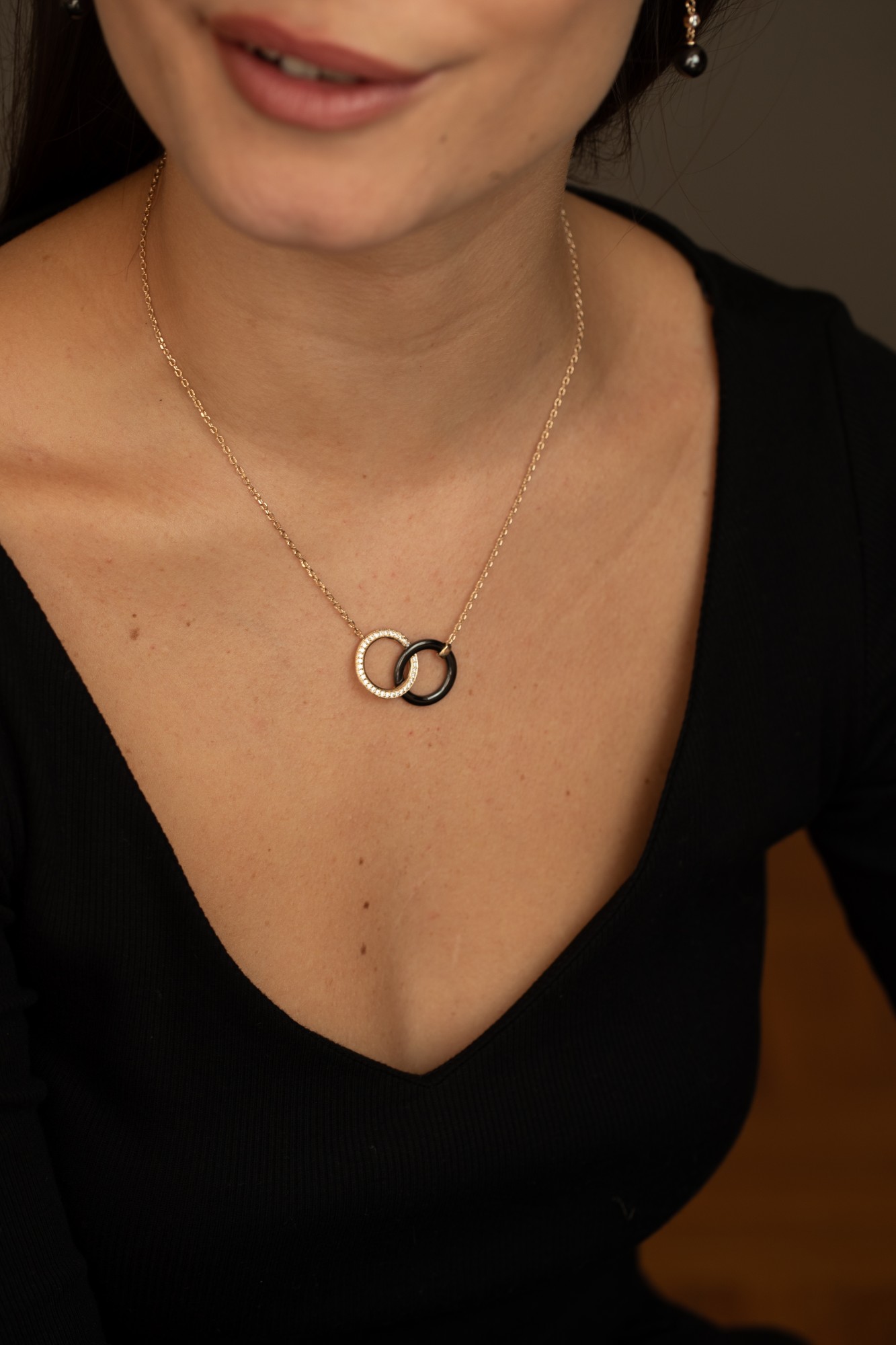 Ses deux anneaux entrelacés — l’un en plaqué or 18 carats serti d’oxydes de zirconium, l’autre en céramique noire lisse — créent un contraste harmonieux entre éclat et intensité.