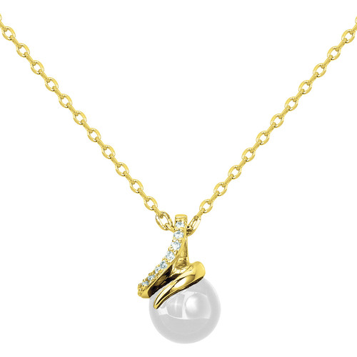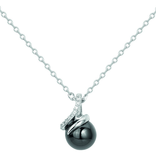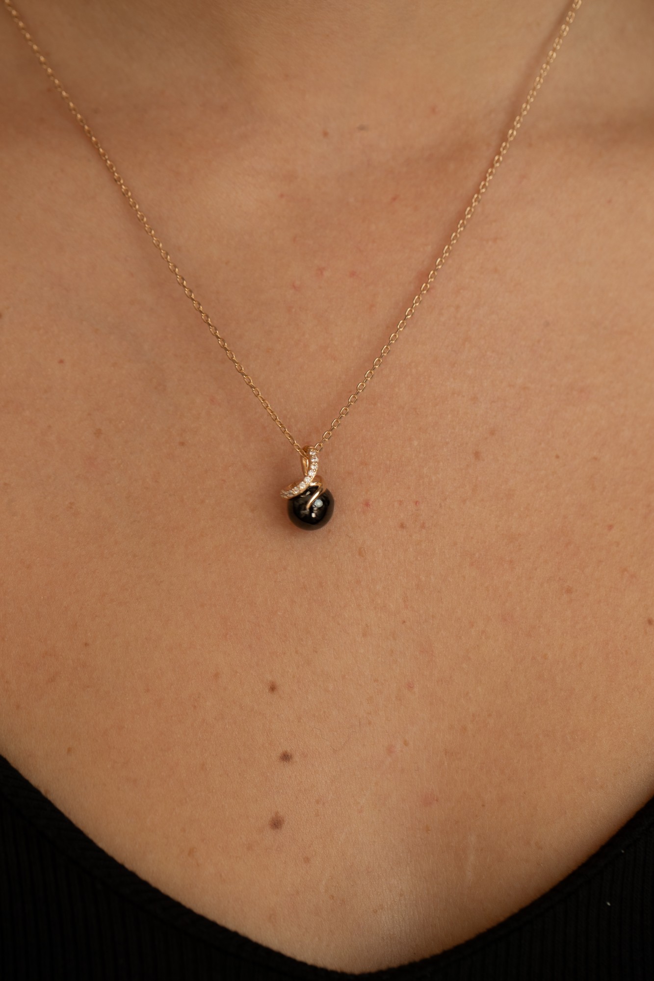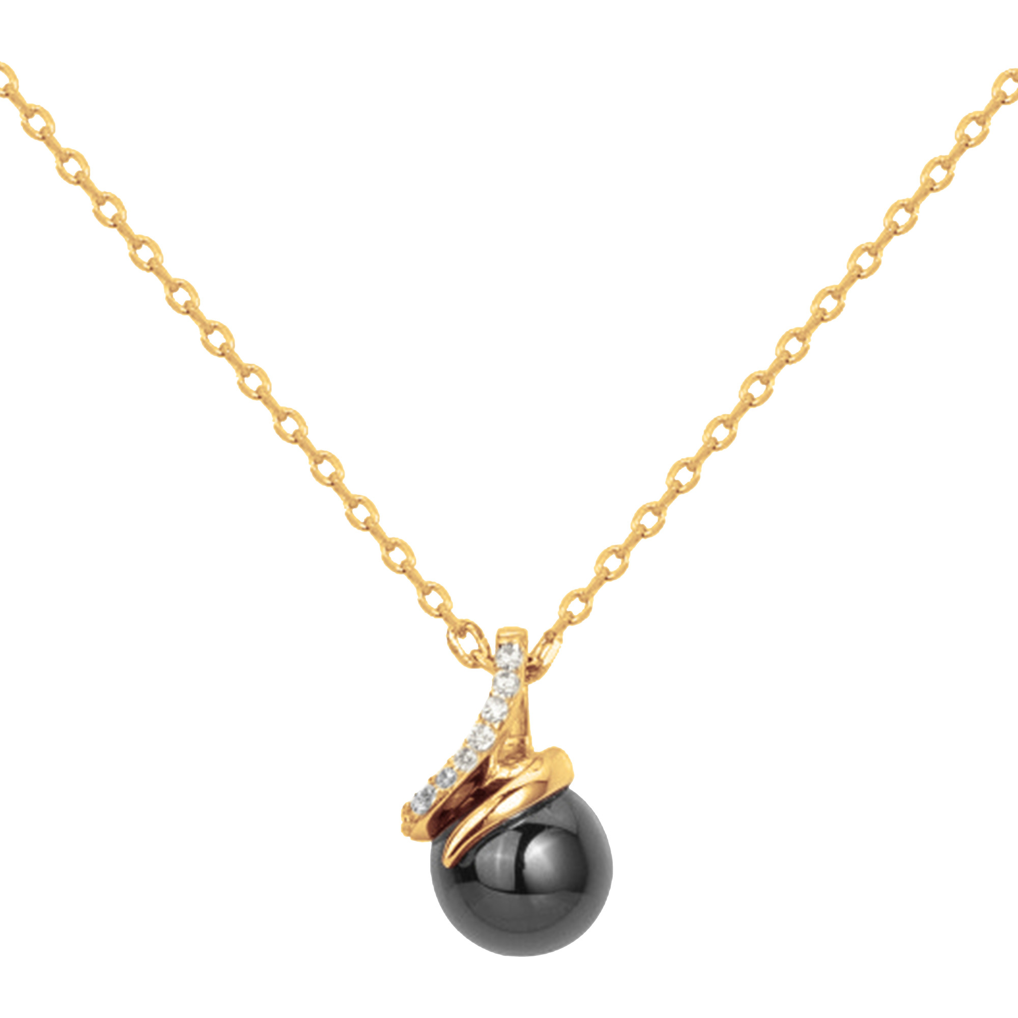 Son pendentif met en scène une perle de céramique noire lisse, enveloppée d’un délicat mouvement en plaqué or 18 carats rehaussé d’oxydes de zirconium.