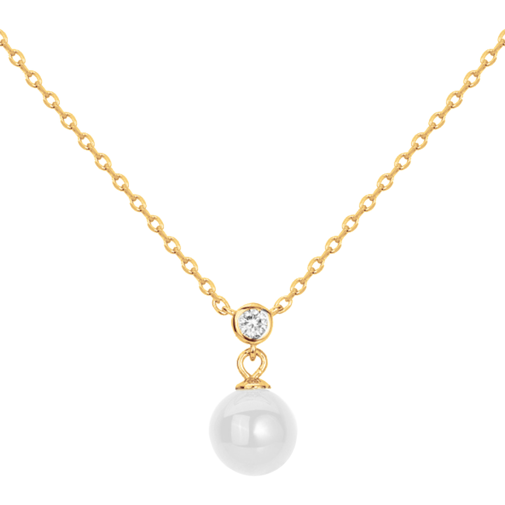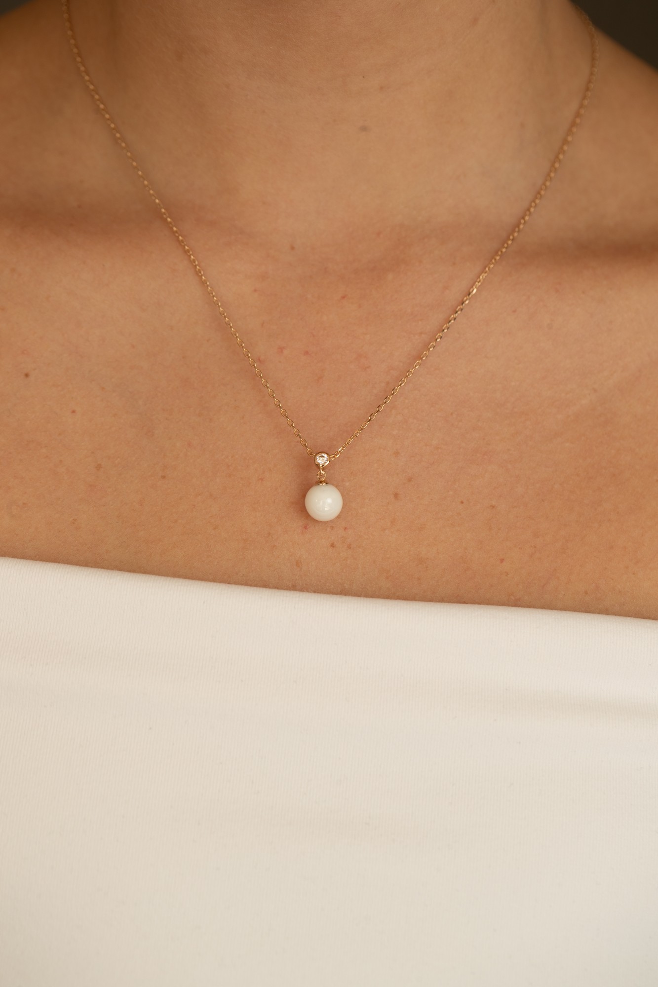 Sa perle de céramique blanche lisse, suspendue à une fine chaîne en plaqué or 18 carats, est surmontée d’un discret oxyde de zirconium serti clos, telle une étoile scintillante.