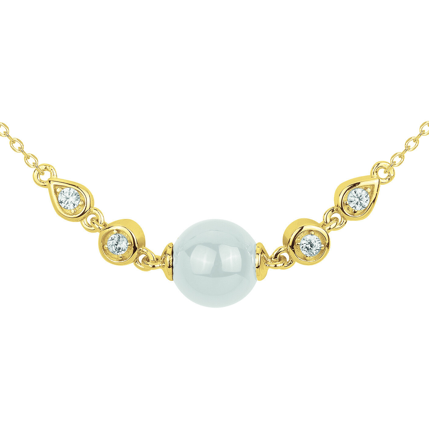 En son centre, une perle de céramique blanche lisse capte la lumière avec douceur, tandis qu’elle est entourée de motifs délicatement travaillés en plaqué or 18 carats, chacun orné d’un oxyde de zirconium scintillant.