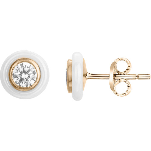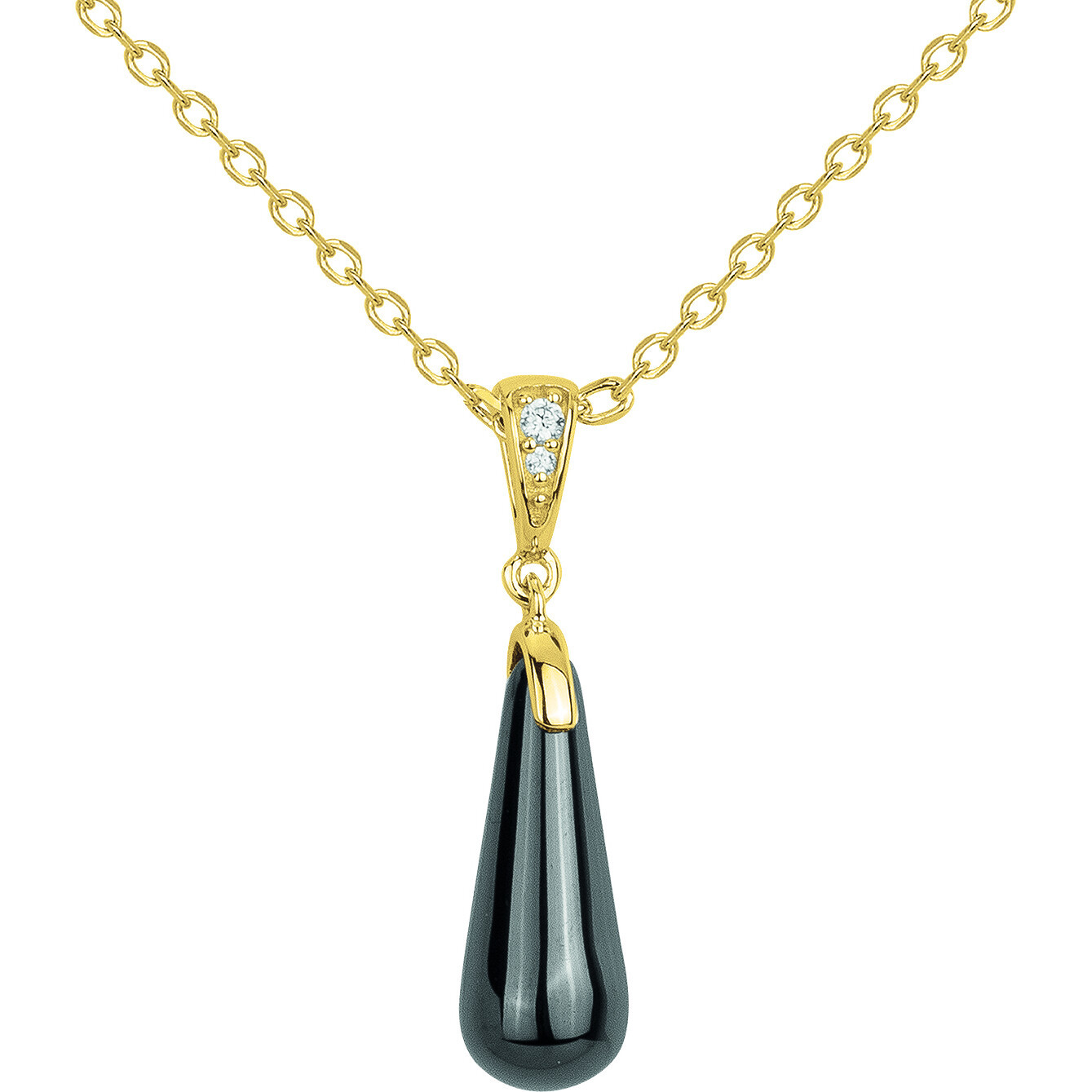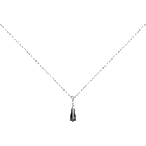 Son pendentif élancé en céramique noire lisse est sublimé par un délicat serti d’oxydes de zirconium sur un support en plaqué or 18 carats, jouant sur le contraste entre éclat et profondeur.