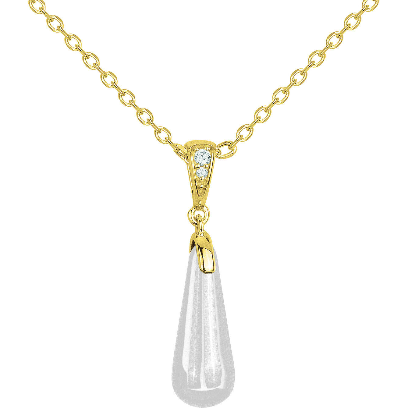 Sa goutte en céramique blanche lisse, délicatement suspendue à une bélière en plaqué or 18 carats ornée d’oxydes de zirconium, capte la lumière avec subtilité.