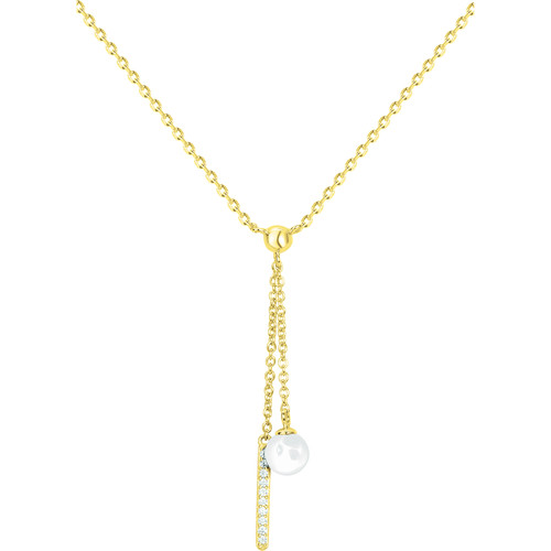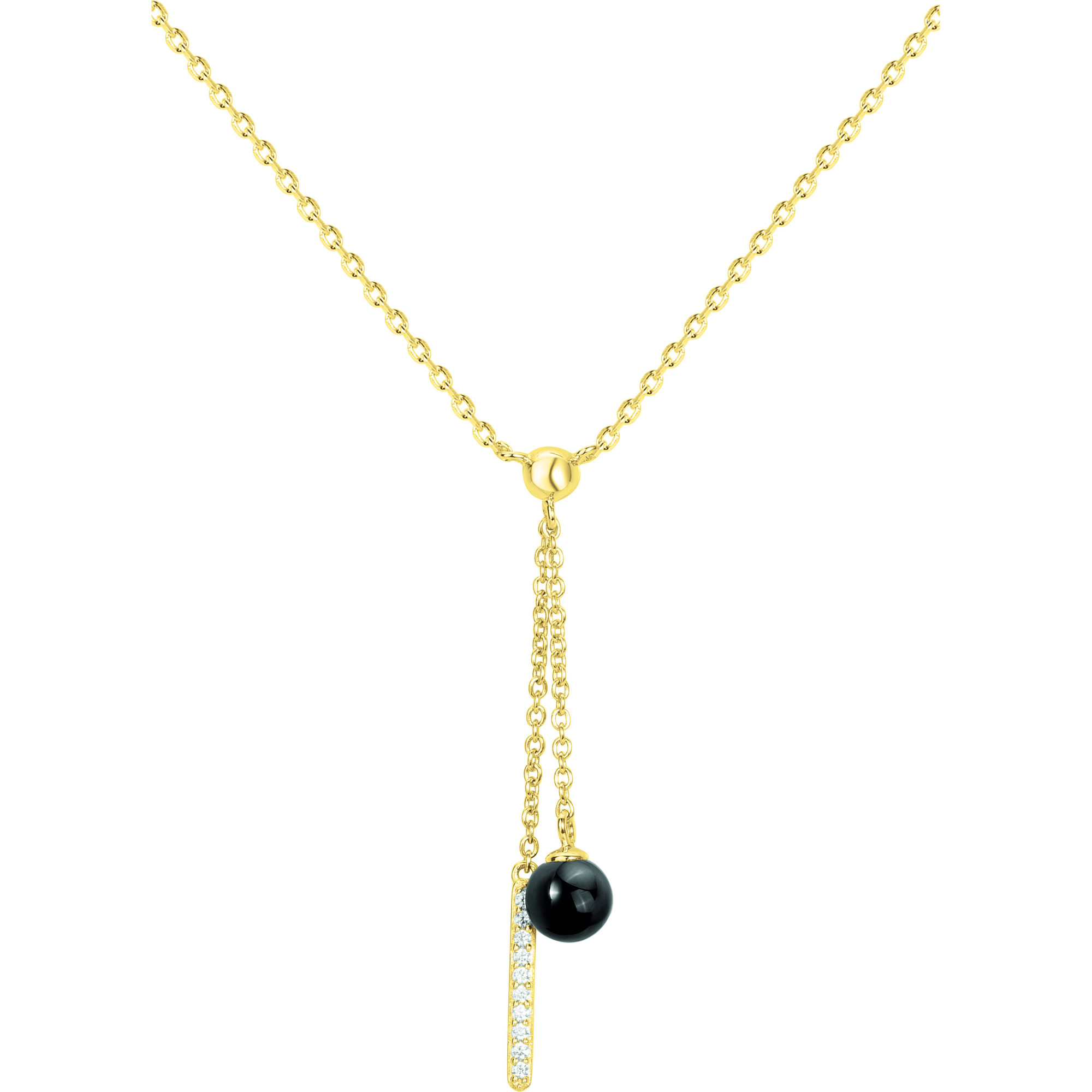 Sa fine chaîne en plaqué or 18 carats se prolonge en un pendentif double, ponctué d’une perle en céramique noire lisse au mouvement délicat.