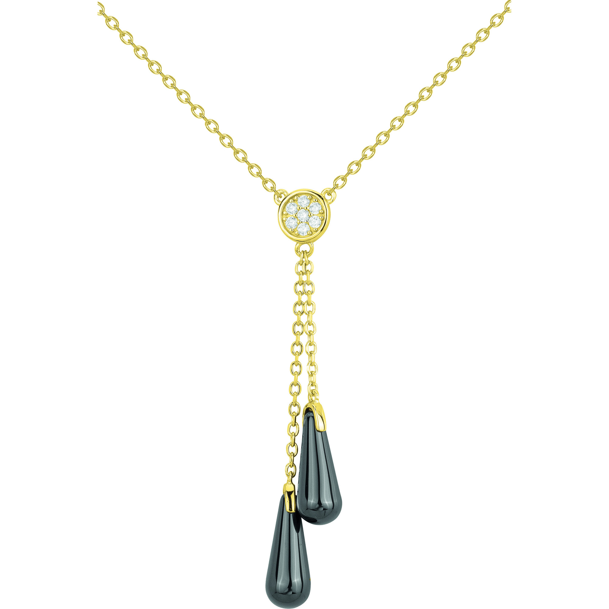 Son motif central en plaqué or 18 carats, orné d’oxydes de zirconium, se prolonge par deux pampilles terminées de gouttes en céramique noire lisse.
