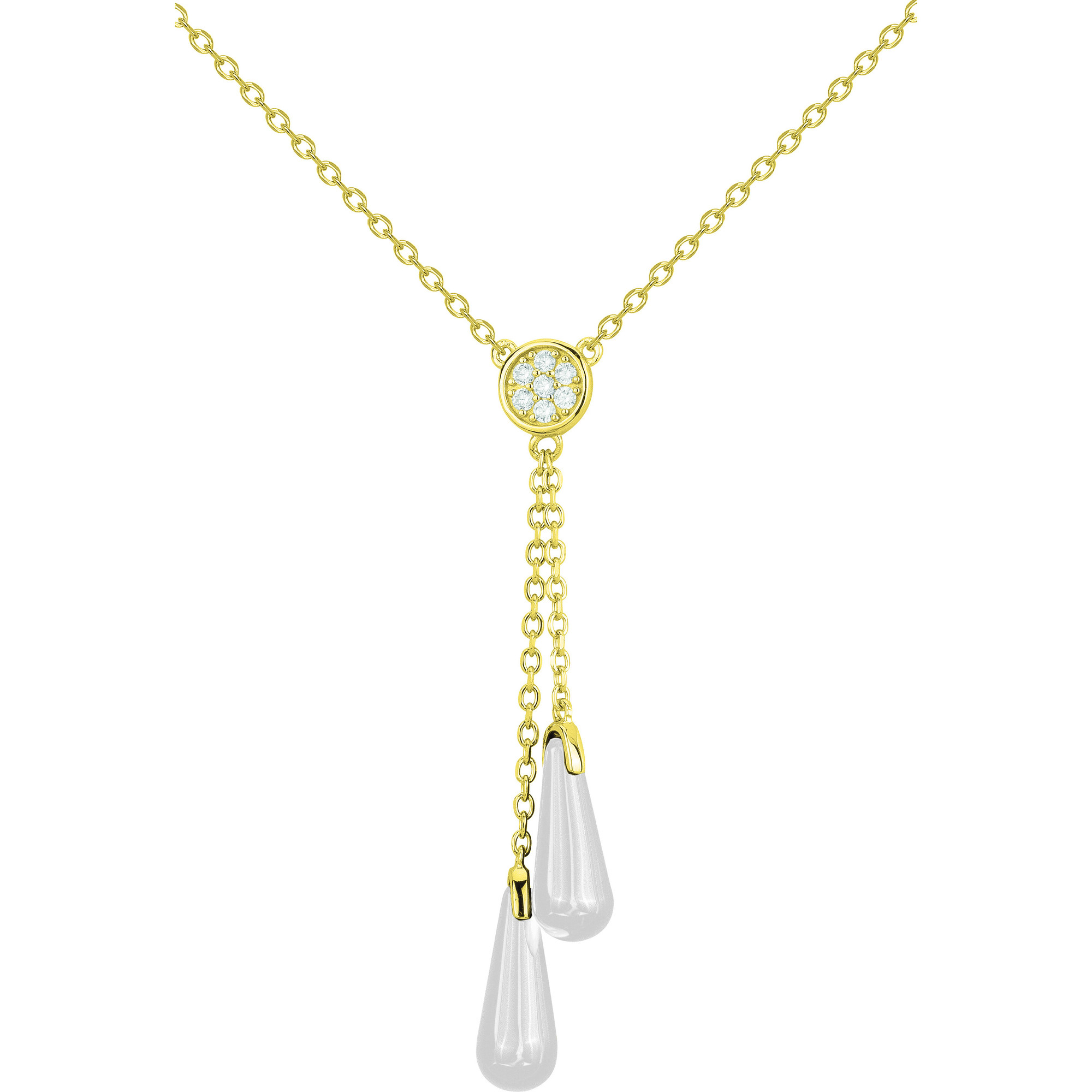 Son motif en plaqué or 18 carats, rehaussé d’oxydes de zirconium, met en valeur deux gouttes en céramique blanche lisse, suspendues avec grâce.