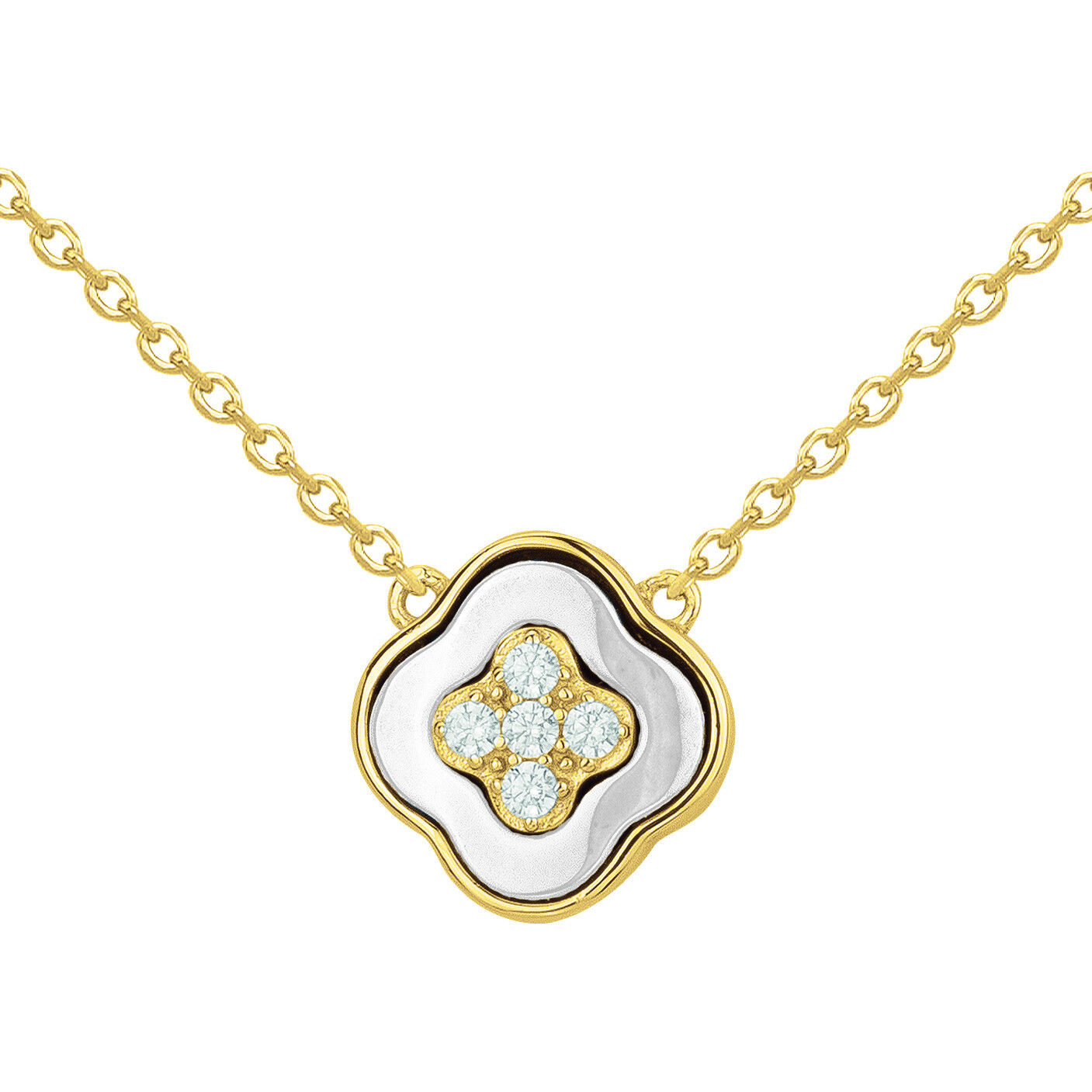 Son pendentif en forme de trèfle stylisé associe la céramique blanche lisse à la chaleur du plaqué or 18 carats, rehaussée en son centre d’un motif pavé d’oxydes de zirconium.