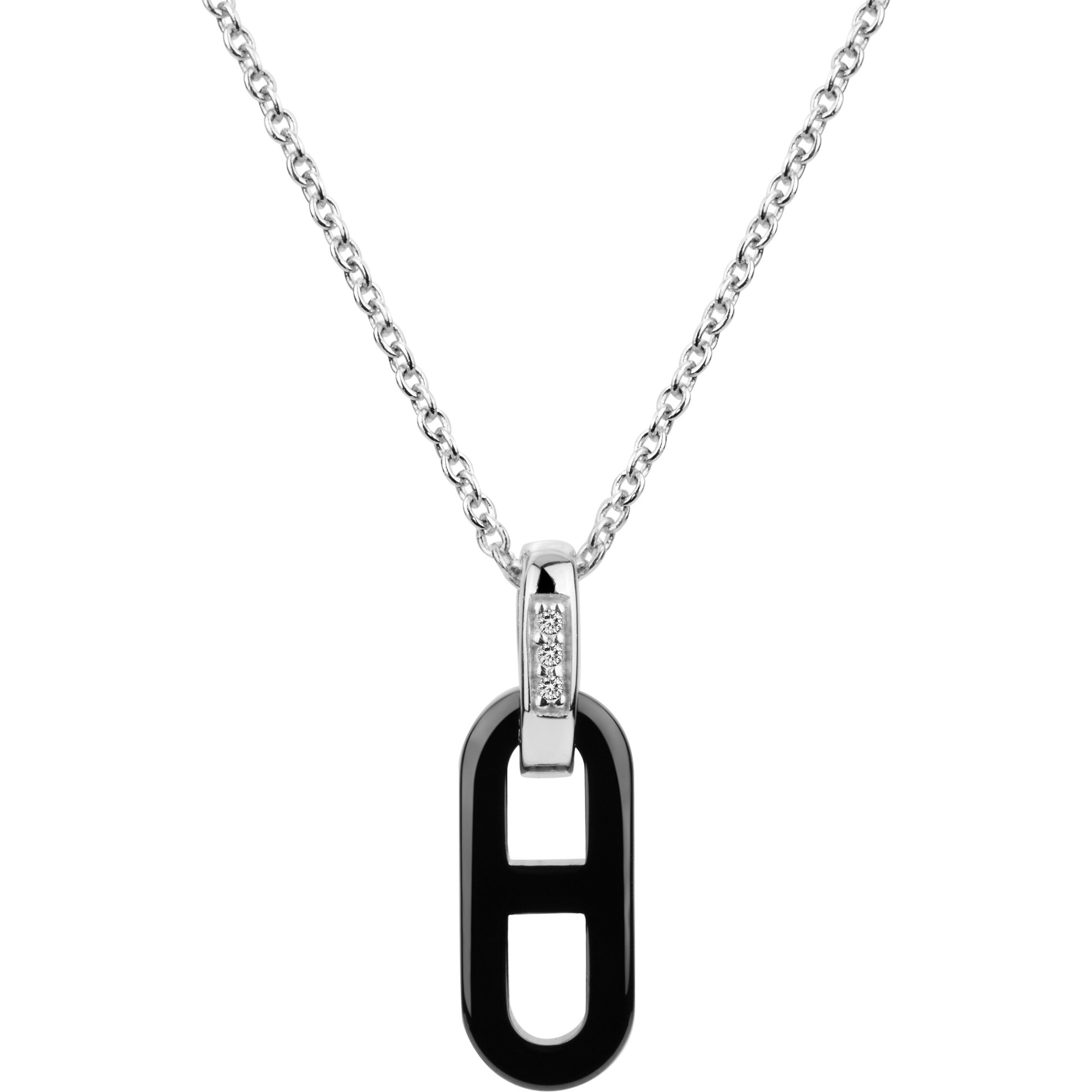 Son pendentif ajouré en céramique noire lisse, suspendu à une bélière en argent 925 rhodié sertie d’oxydes de zirconium, dessine une silhouette graphique et épurée.
