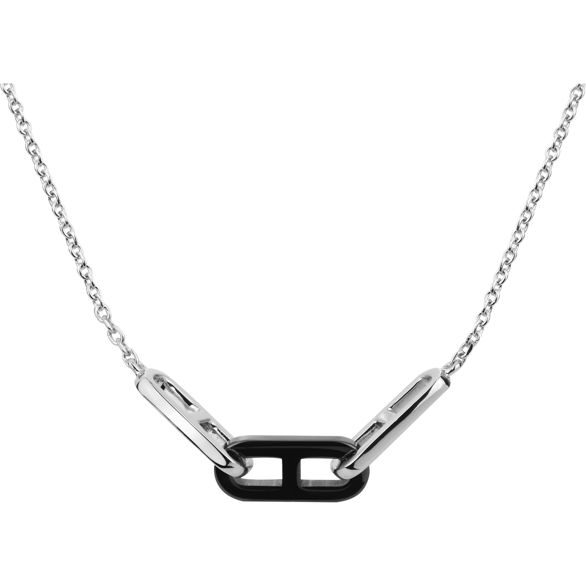 Trois maillons s’entrelacent : deux en argent 925 rhodié, éclatants de lumière, et un central en céramique noire lisse, apportant contraste et profondeur.