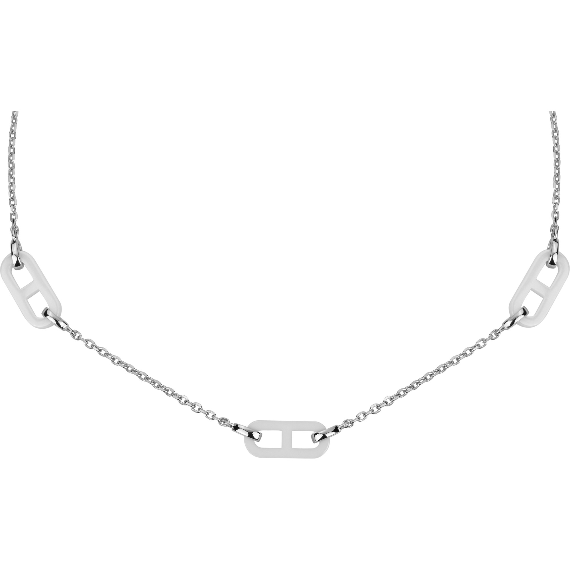 Les maillons en céramique blanche lisse s’alternent avec des éléments en argent 925 rhodié, offrant un contraste délicat et lumineux.