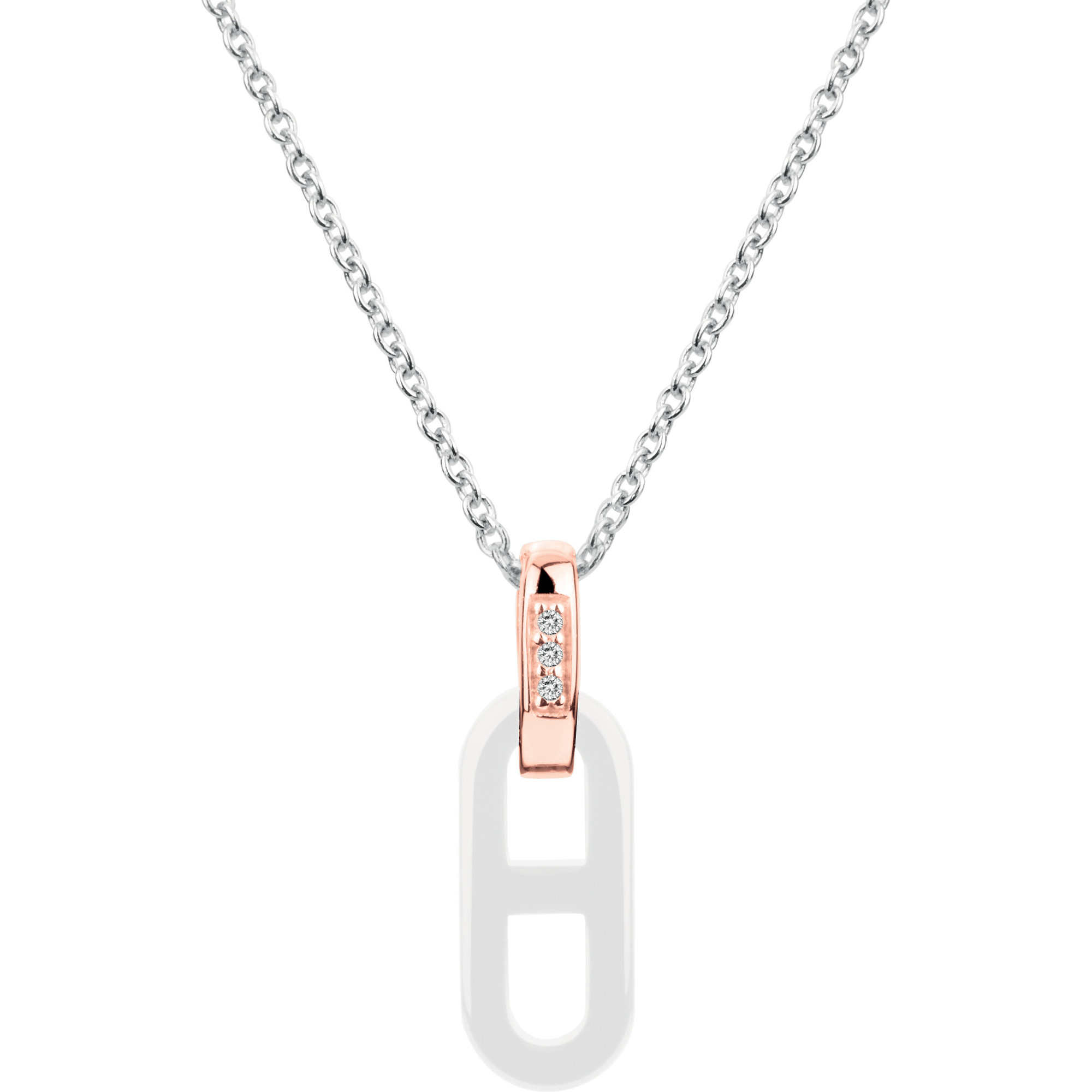 Son pendentif ajouré en céramique blanche lisse s’attache à une bélière en plaqué or rose sertie d’oxydes de zirconium, suspendue à une chaîne en argent 925 rhodié.
