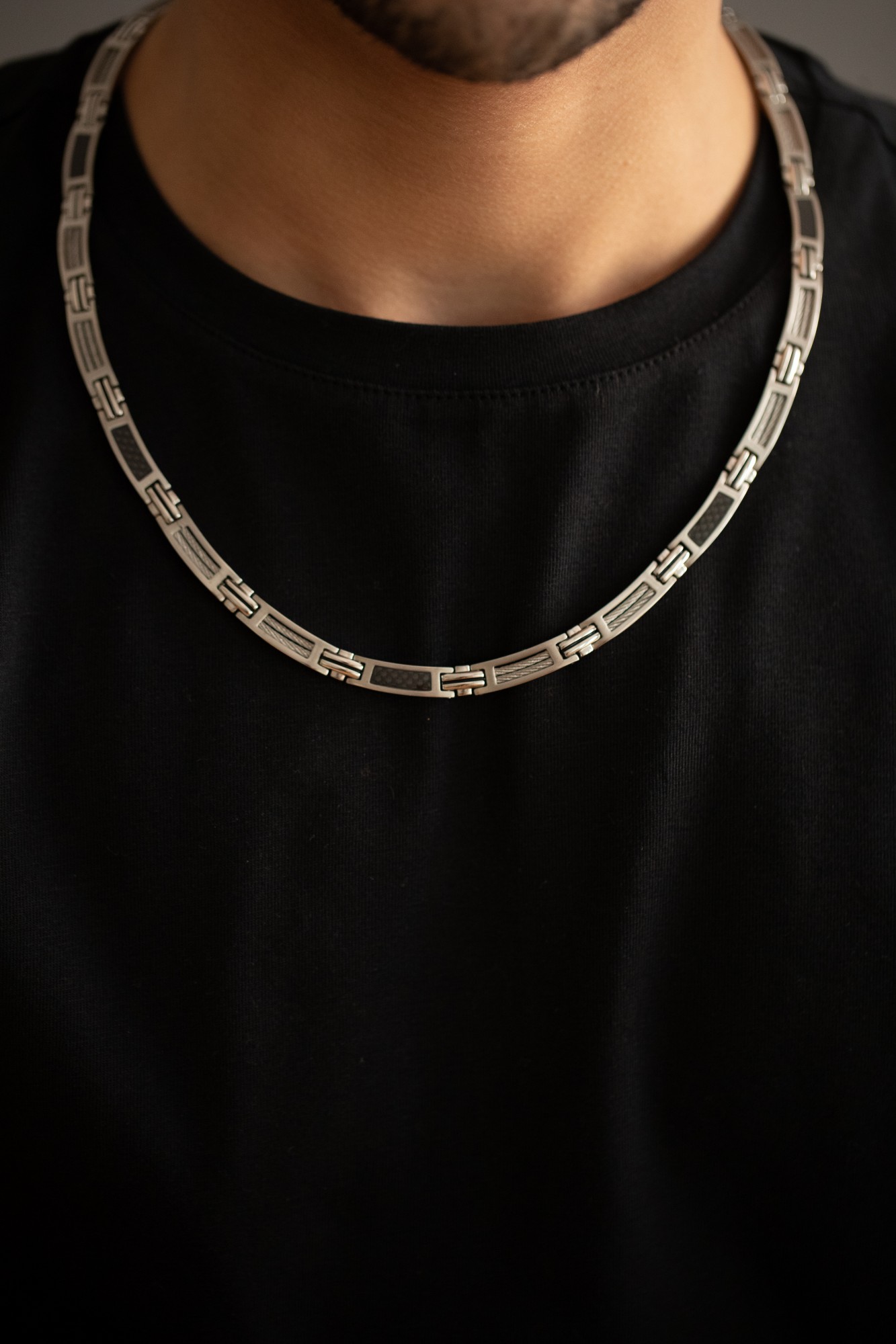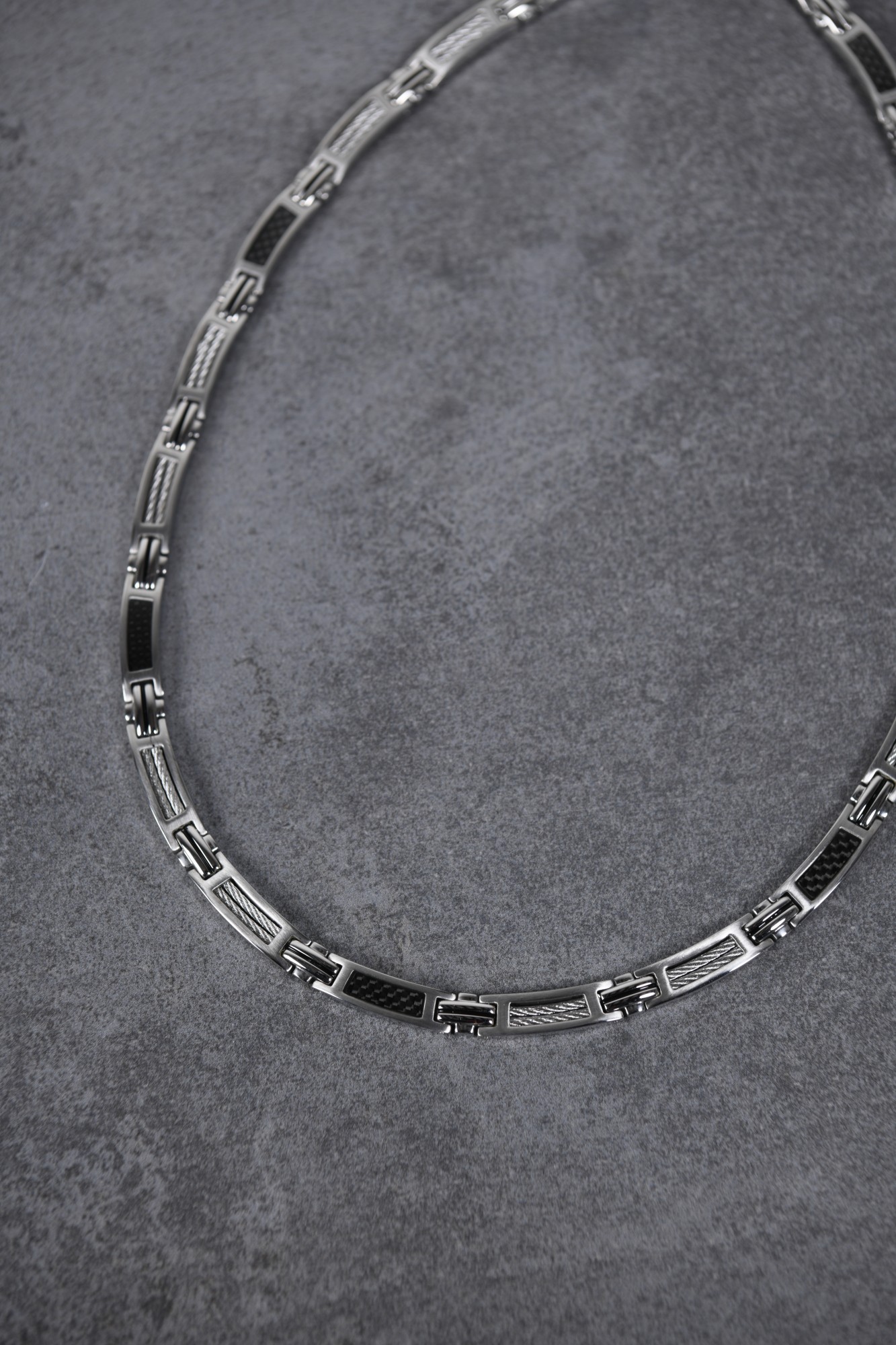 Un modèle très design en acier 316L inoxydable. Ce collier attire immanquablement les regards grâce à une alternance harmonieuse entre câbles en acier blanc brillant et motifs en carbone noir. Sa longueur de 50 cm apporte une grande prestance à ton style. Garanti 2 ans, ce bijou est sécurisé par un clip à double fermoir. Le collier Jonas, entre puissance et séduction. Phebus te propose cette belle création pour homme en acier inoxydable, destinée à extérioriser ta masculinité. Une chaîne qui brille élégamment sur des vêtements aux coloris affirmés.