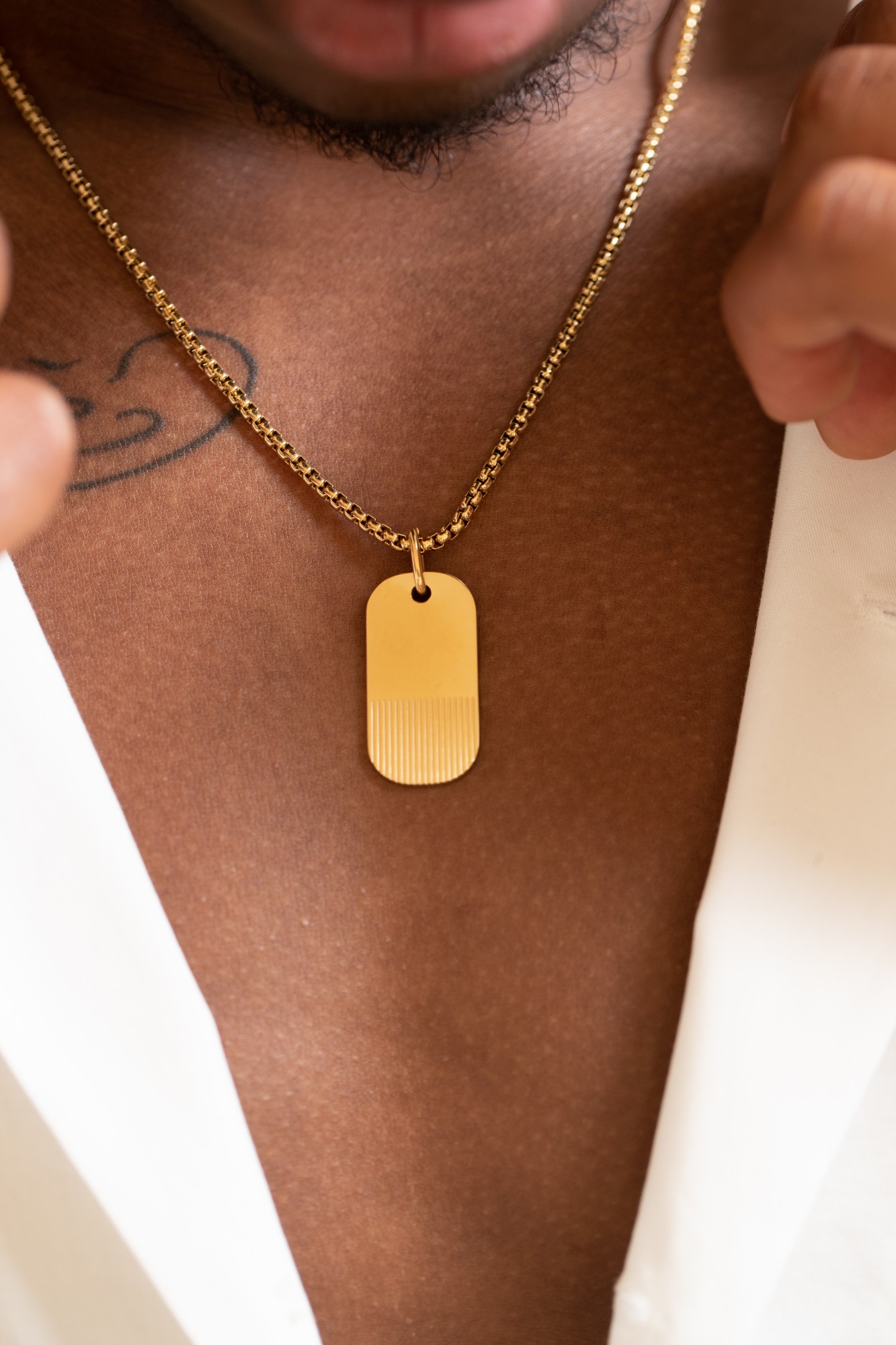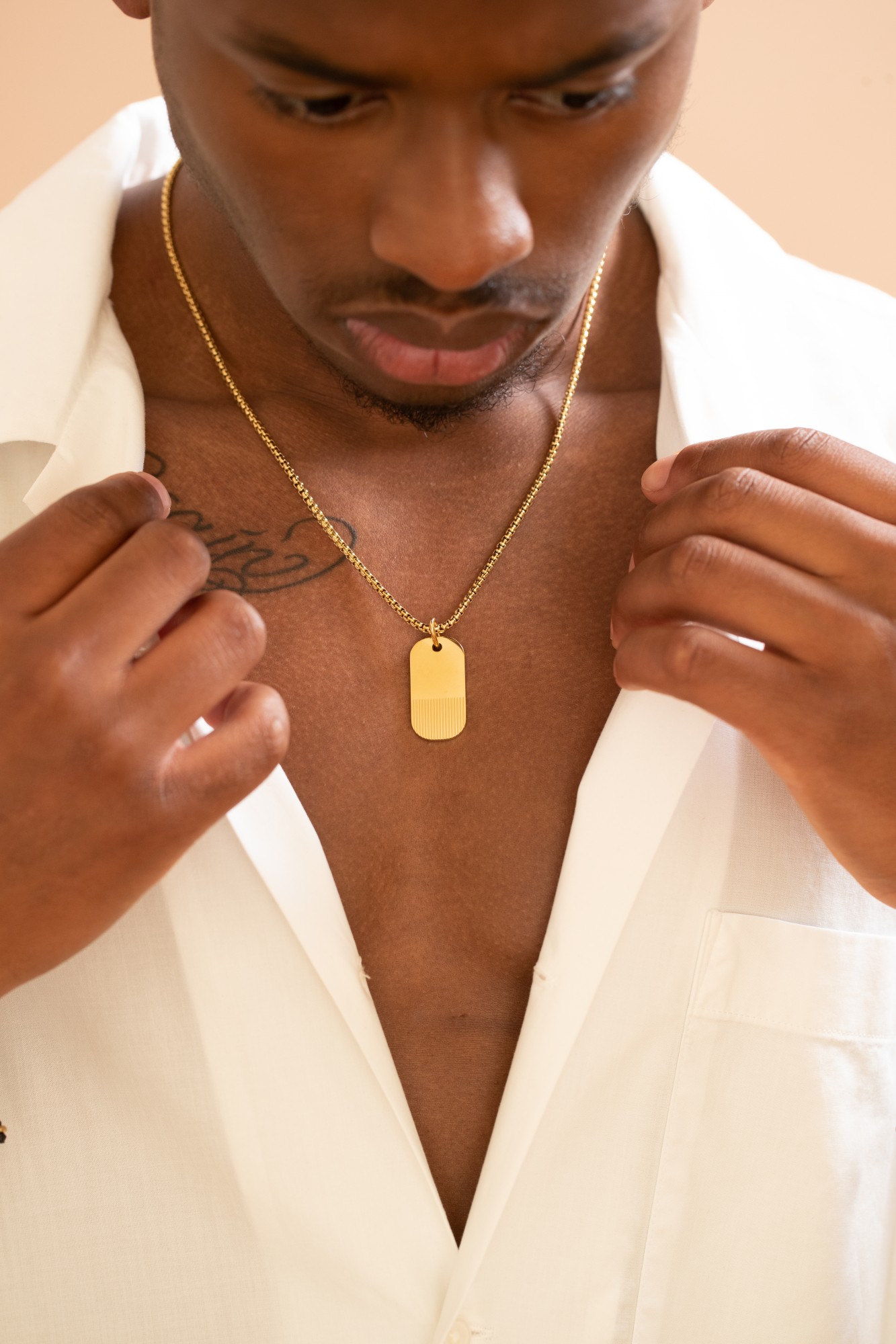 Une plaque stylisée, fine et masculine. Ce collier en acier 316L inoxydable de forme oblongue, à l'envoûtante couleur dorée, est garanti 2 ans. Composé d'une chaîne de 50 + 5 cm fermée par un mousqueton, il se démarque par son motif symétrique gravé sur la partie inférieure de la plaque. Exprime ta sensibilité et tes goûts esthétiques. Plébiscité pour sa résistance, l'acier symbolise force et puissance. Ce collier inoxydable Phebus pour homme te permet de profiter d'un bijou à la fois solide, élégant et moderne, pour un style tout en nuances.